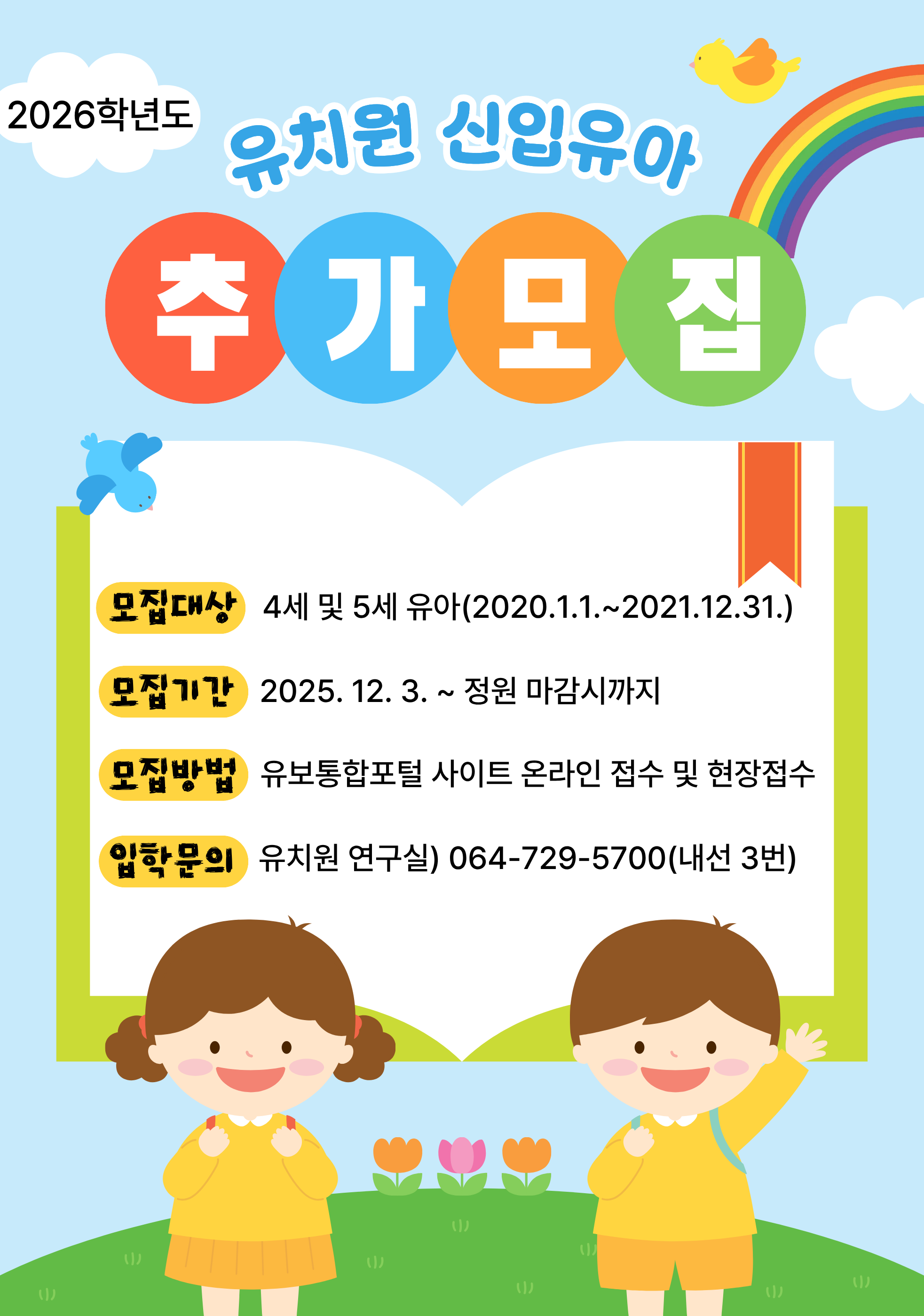 동화초등학교 공고 제2025-45호2026학년도 유치원 신입 유아 추가모집 변경 공고 2026학년도 동화초등학교병설유치원 신입 유아 추가모집을 아래와 같이 변경하여 공고합니다.2025년 12월 24일동화초등학교병설유치원장----------------------------------------------------------1. 모집 인원 및 대상모집대상모집인원연령생년월일3세2022. 1. 1. ~ 2023. 2. 28.14명4세2021. 1. 1. ~ 2021. 12. 31.5명5세2020. 1. 1. ~ 2020. 12. 31.1명2. 모집 기간: 2025. 12. 26.(금) 09:00 ~ 정원 마감 시까지 3. 모집 방법: 유보통합 포털 사이트 추가모집 등록순 선착순 선발 1) 유보통합포털 사이트 접수: 2025. 12. 26.(금) ~ 2026. 2. 13.(금) 2) 현장접수: 2025. 12. 26.(금) ~ 정원 마감 시까지4. 기타사항: 정원 마감 후 접수하는 유아는 대기자로 관리함 5. 문의전화: 유치원 교원연구실 ☏ 729-5700(내선 3번)