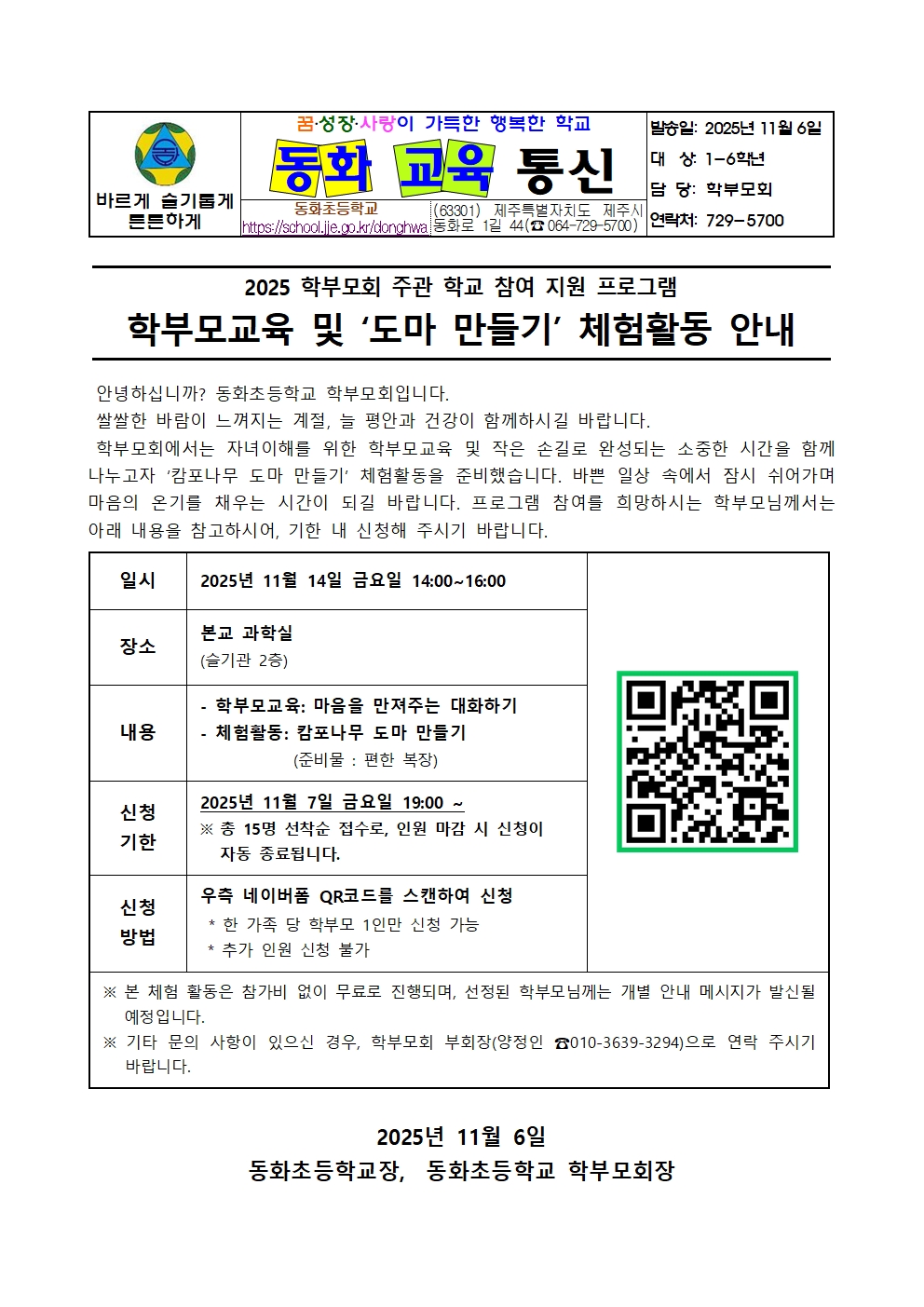학부모회 학교참여지원프로그램 학부모교육 및 '도마만들기' 체험활동 안내