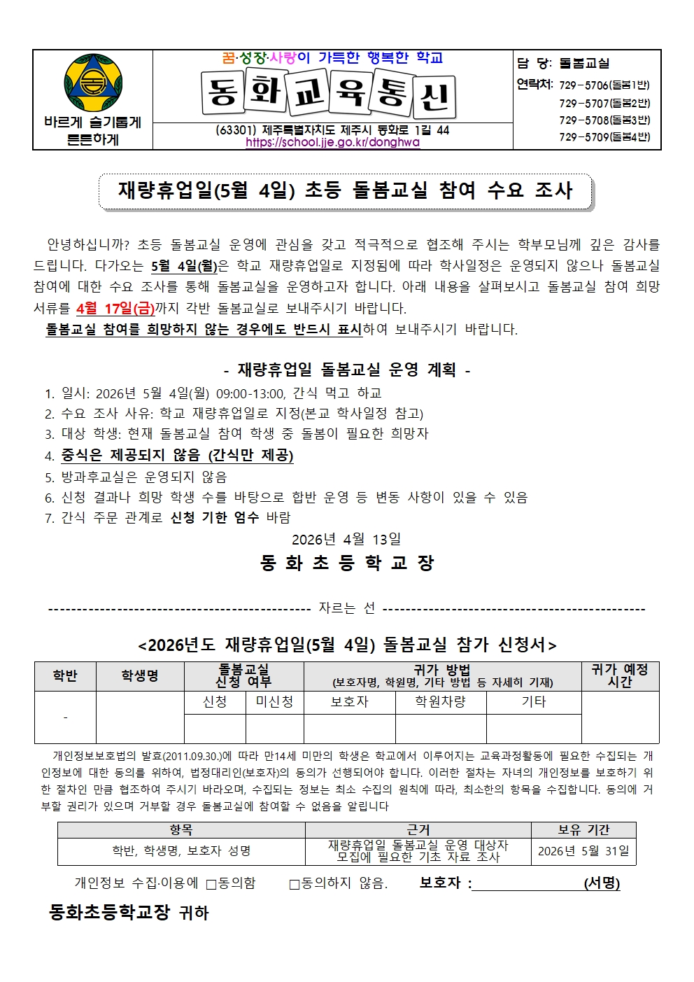 재량휴업일(5월4일) 초등 돌봄교실 참여 수요 조사