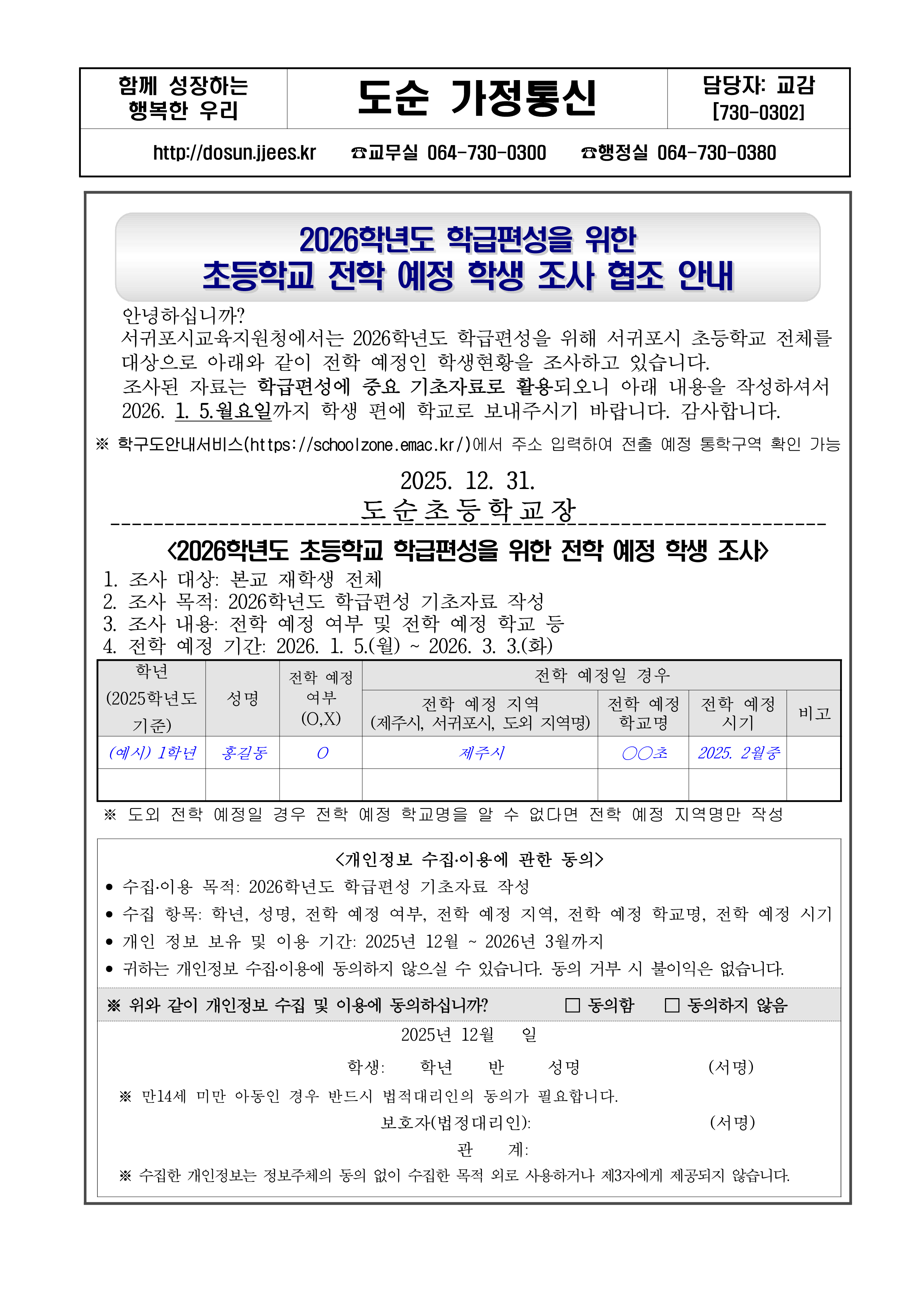 2026학년도 학급편성을 위한 초등학교 전학 예정 학생 조사 협조 안내