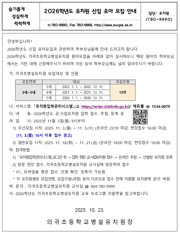 2026학년도 의귀초등학교병설유치원 신입원아모집에 대해 안내드립니다.