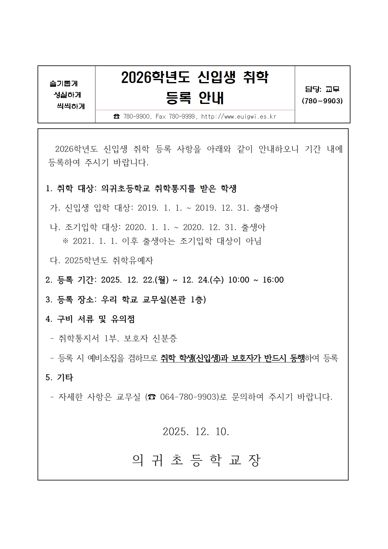 2026학년도 신입생 취학 등록 안내