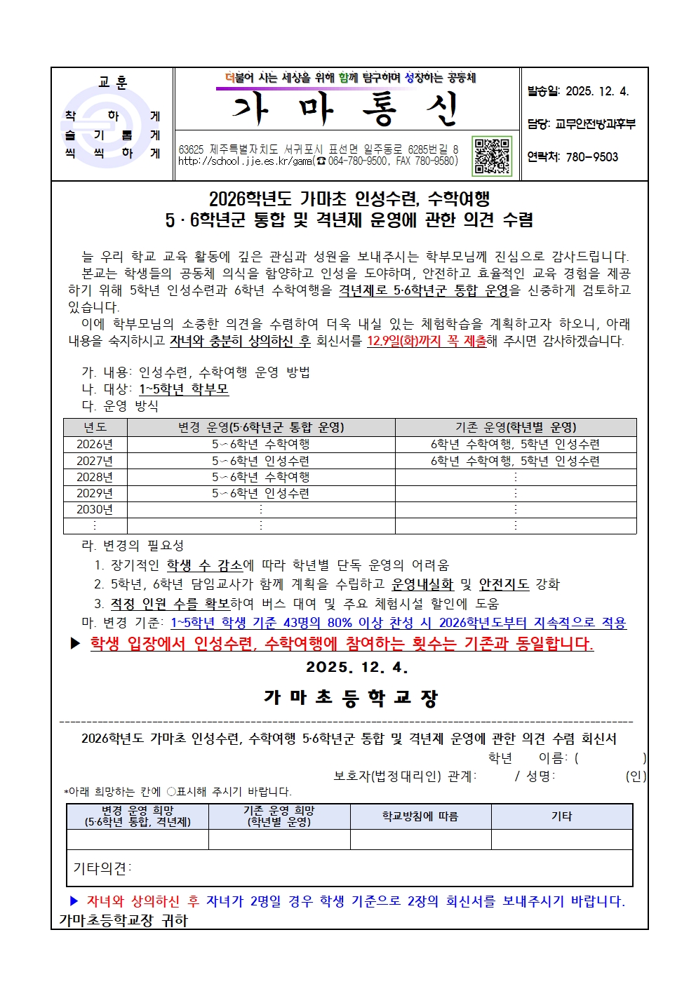 가마초 인성수련, 수학여행 5·6학년군 통합 및 격년제 운영에 관한 의견 수렴