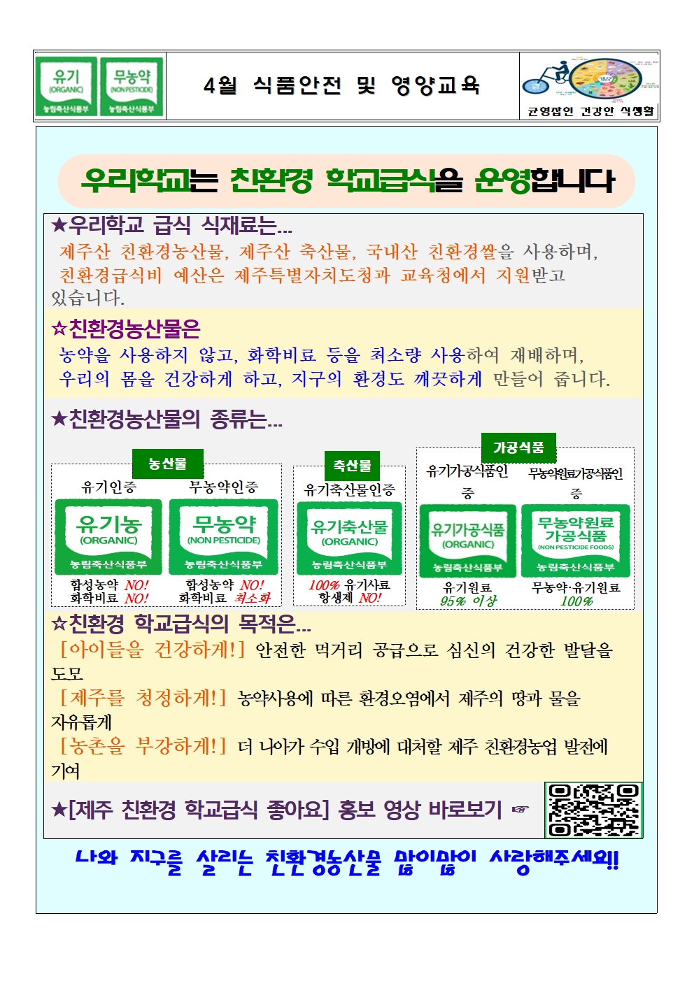 4월 월간식단 안내 및 식품안전 영양교육(우리학교는 친환경 학교급식을 운영합니다)