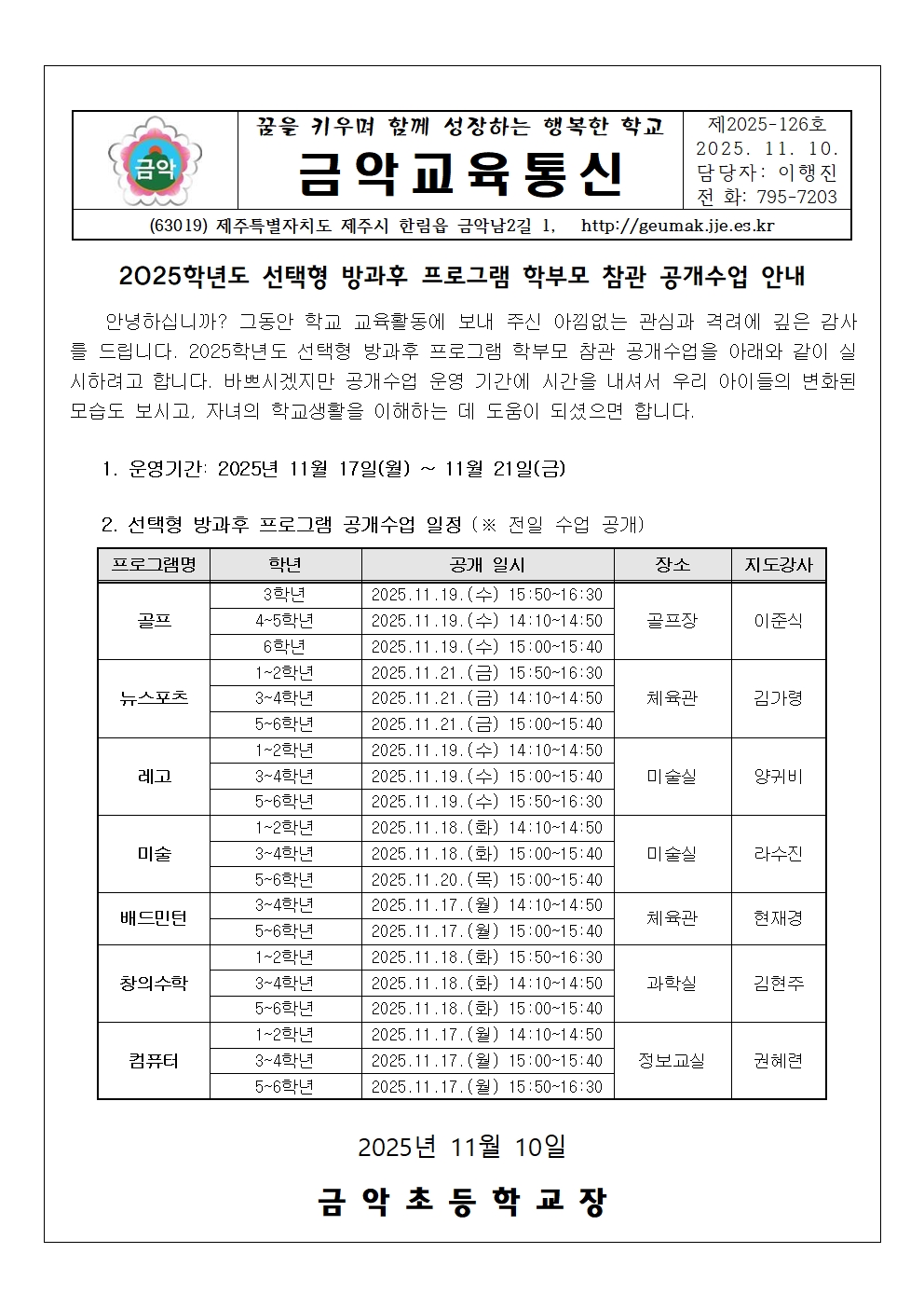 2025학년도 선택형 방과후 프로그램 학부모 참관 공개수업 안내