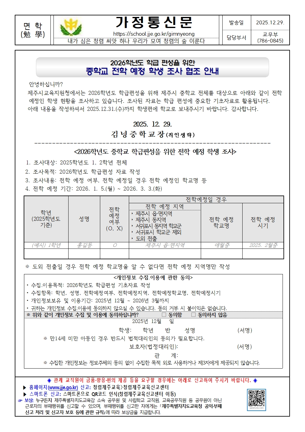 2026학년도 학급 편성을 위한 중학교 전학 예정 학생 조사 협조 안내 가정통신문