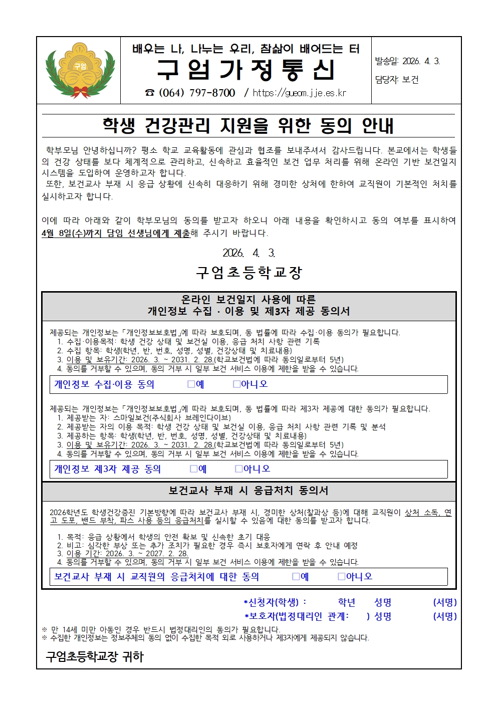 학생 건강관리 지원을 위한 동의 안내