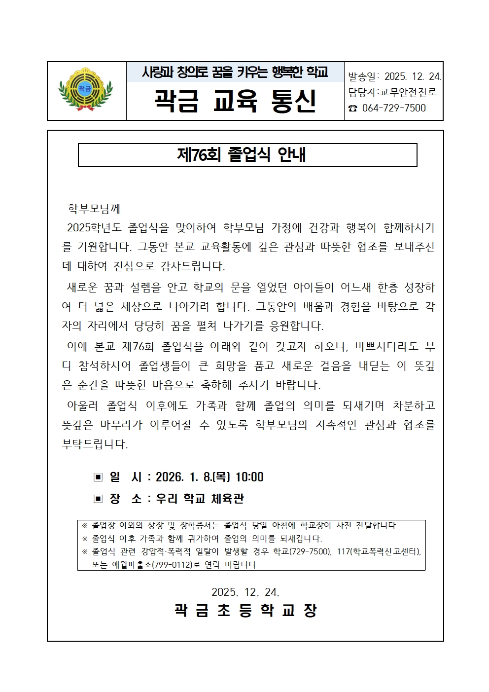 곽금초등학교 제76회 졸업식 안내
