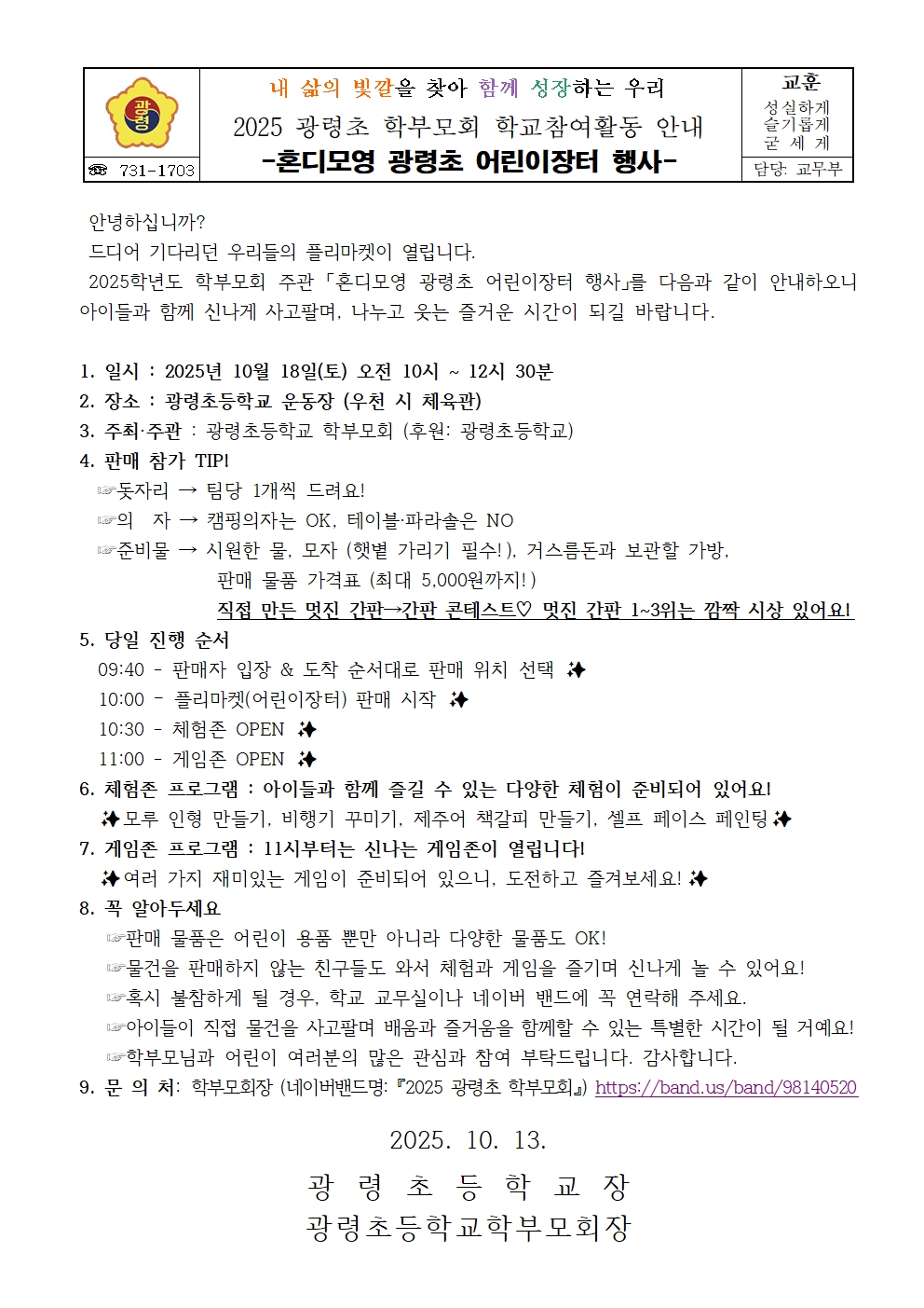 2025 광령초 학부모회 학교참여활동(혼디모영 광령초 어린이장터 행사) 안내