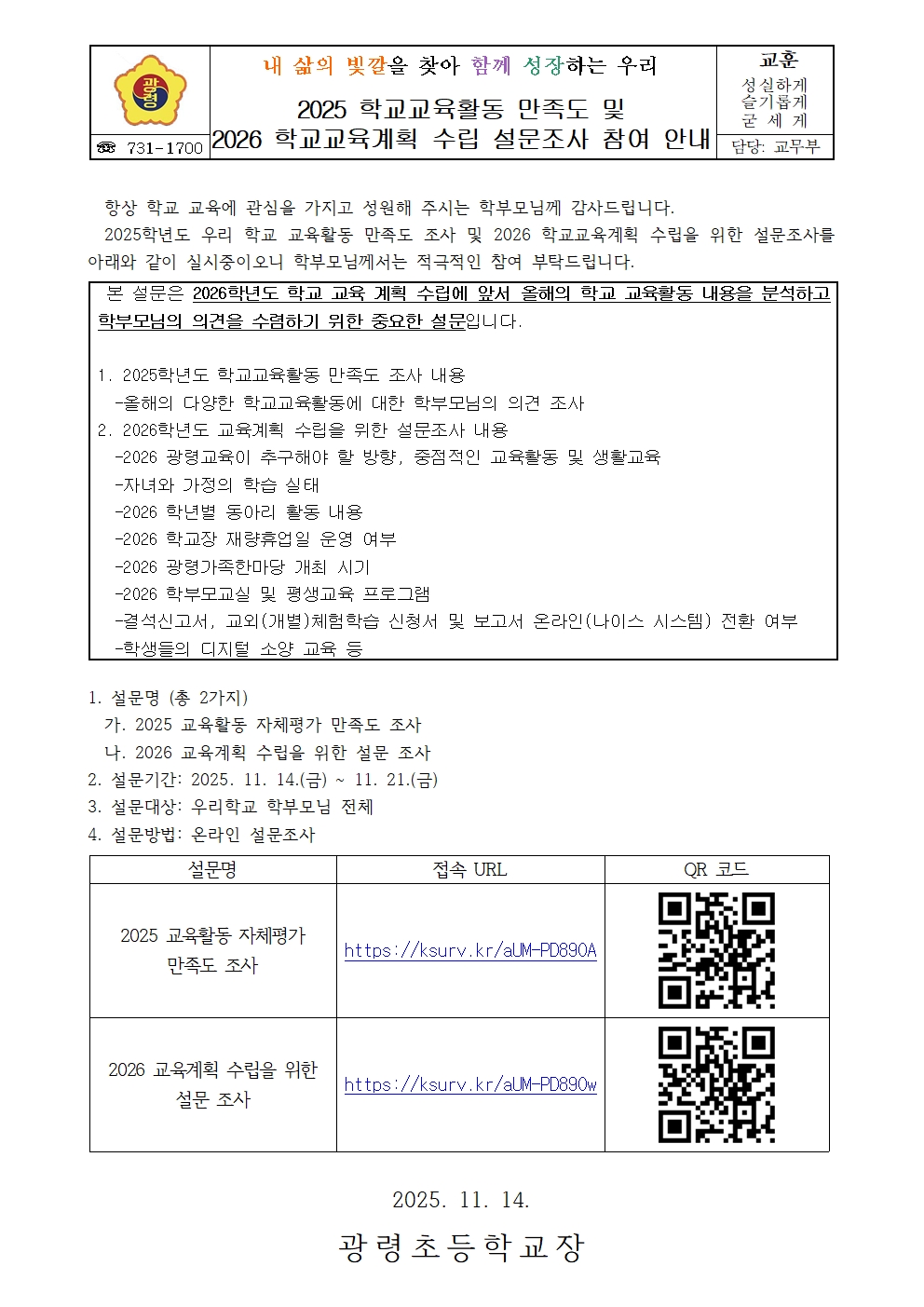2025 학교교육활동 만족도 및 2026 학교교육계획 수립 설문조사 참여 안내