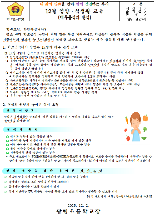 12월 식단안내 및 영양.식생활교육(제주음식과 편식)