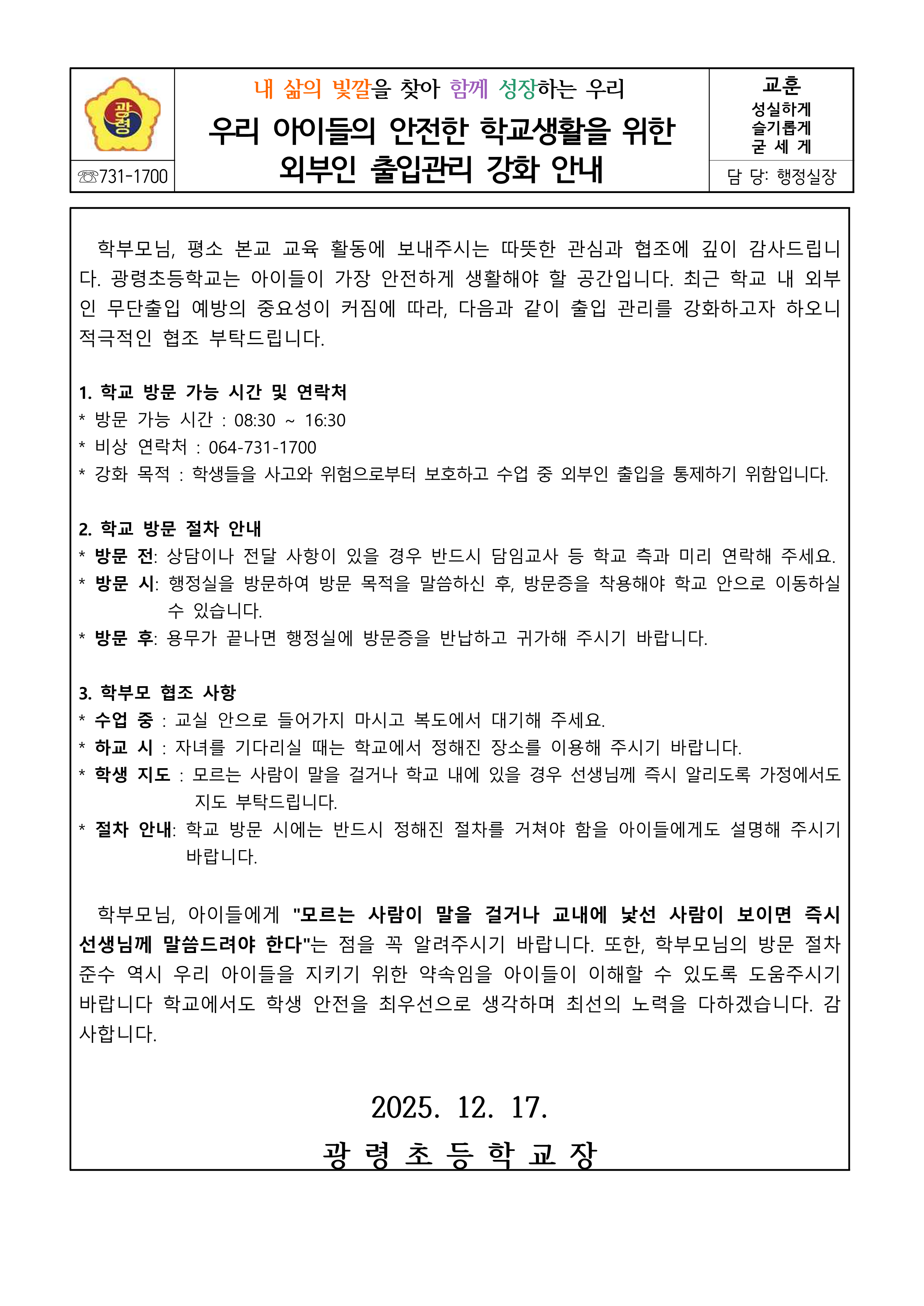 우리 아이들의 안전한 학교생활을 위한 외부인 출입관리 강화 안내