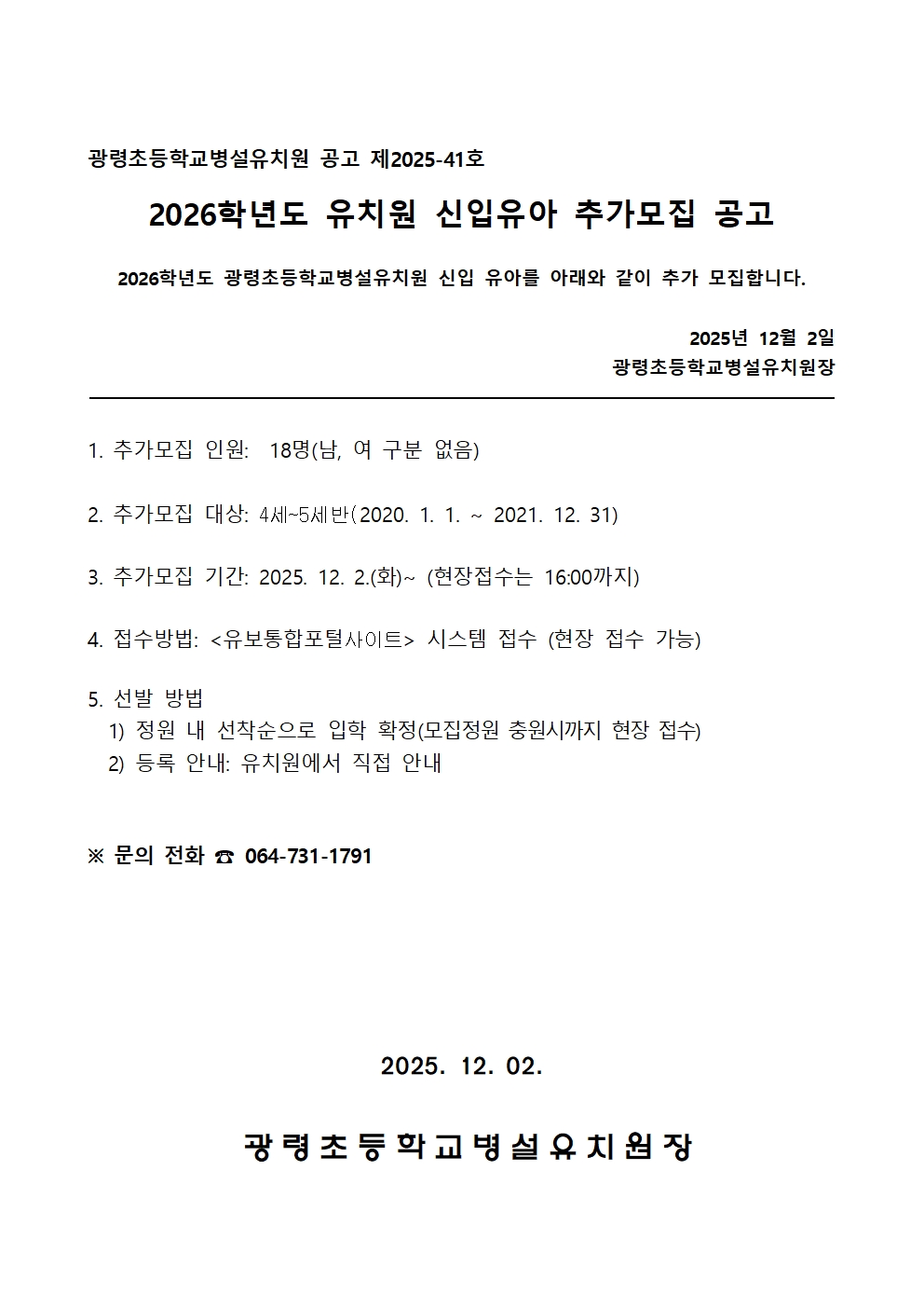 2026학년도 유치원 신입 유아 추가 모집 공고