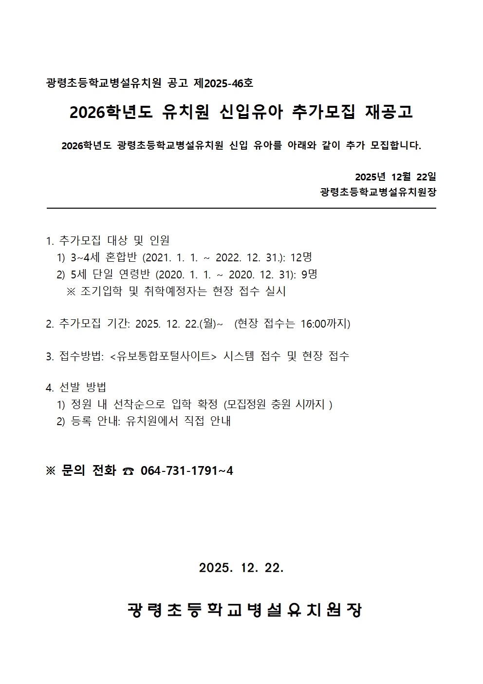 2026학년도 유치원 신입 유아 추가 모집 공고
