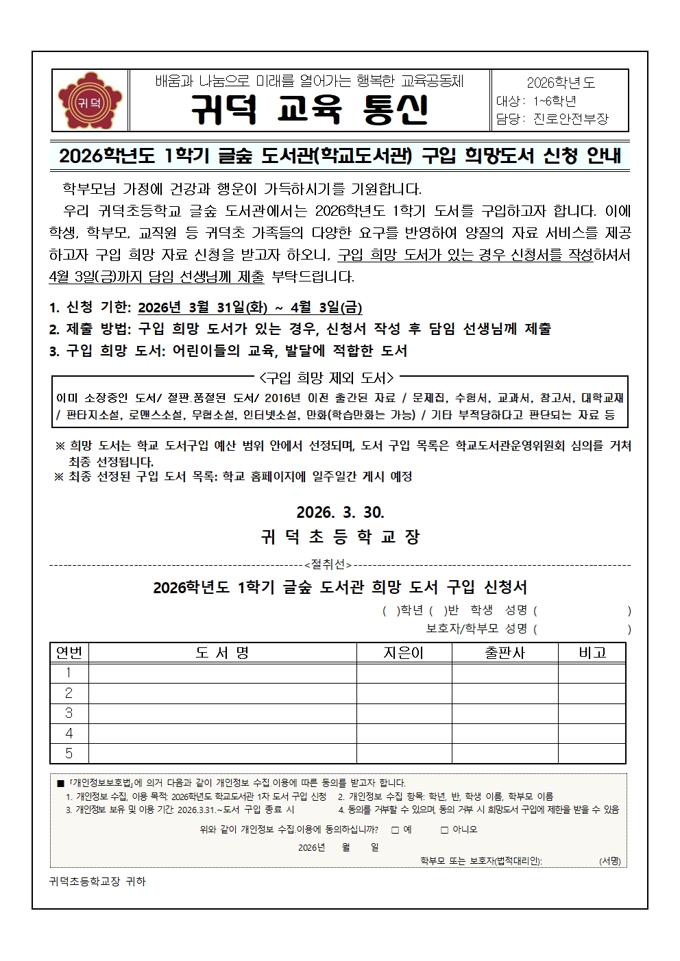 2026학년도 1학기 글숲도서관(학교도서관) 구입 희망도서 신청 안내
