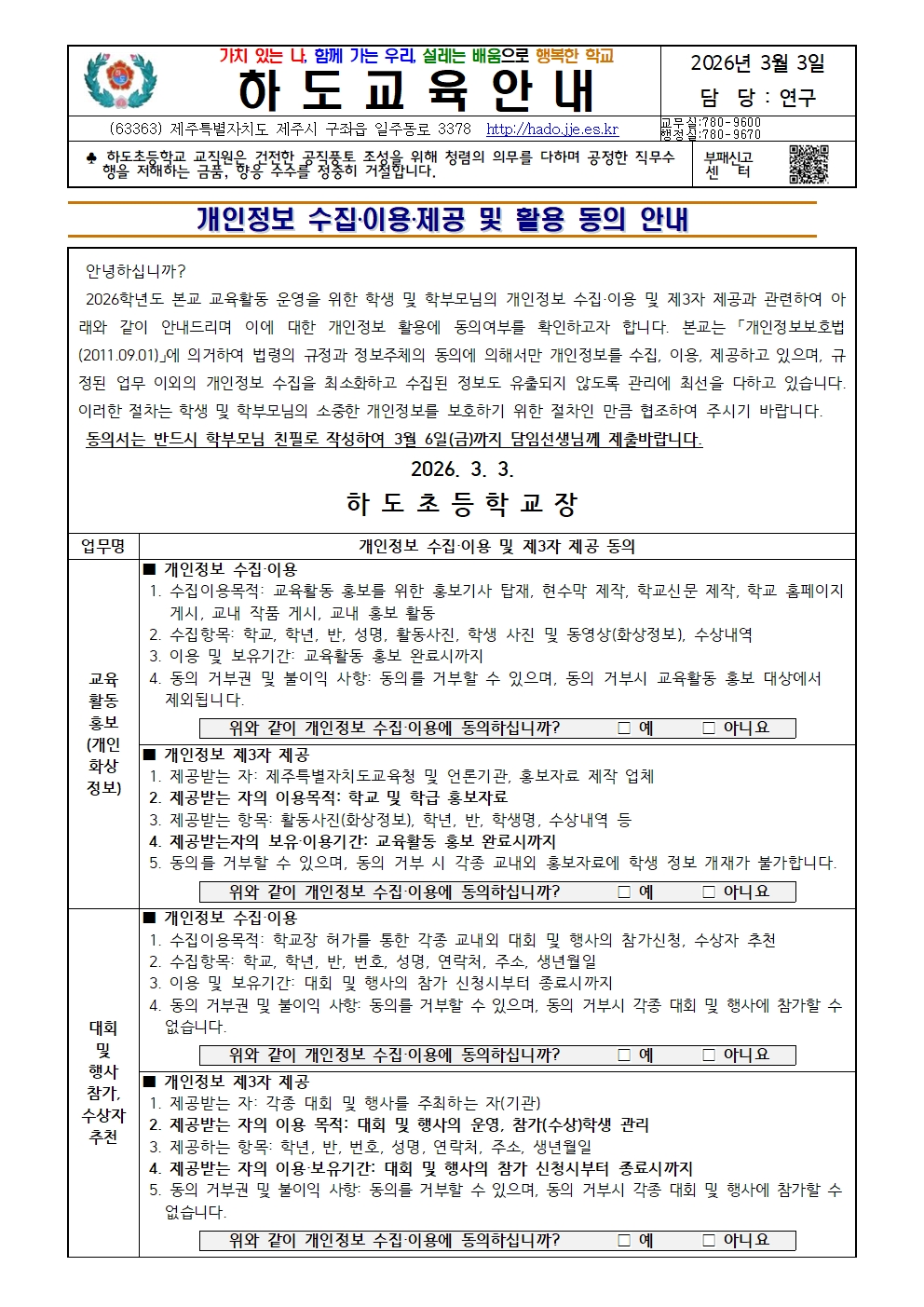 [가정통신문] 개인정보 수집, 이용, 제공 및 활용 동의 안내.hwp