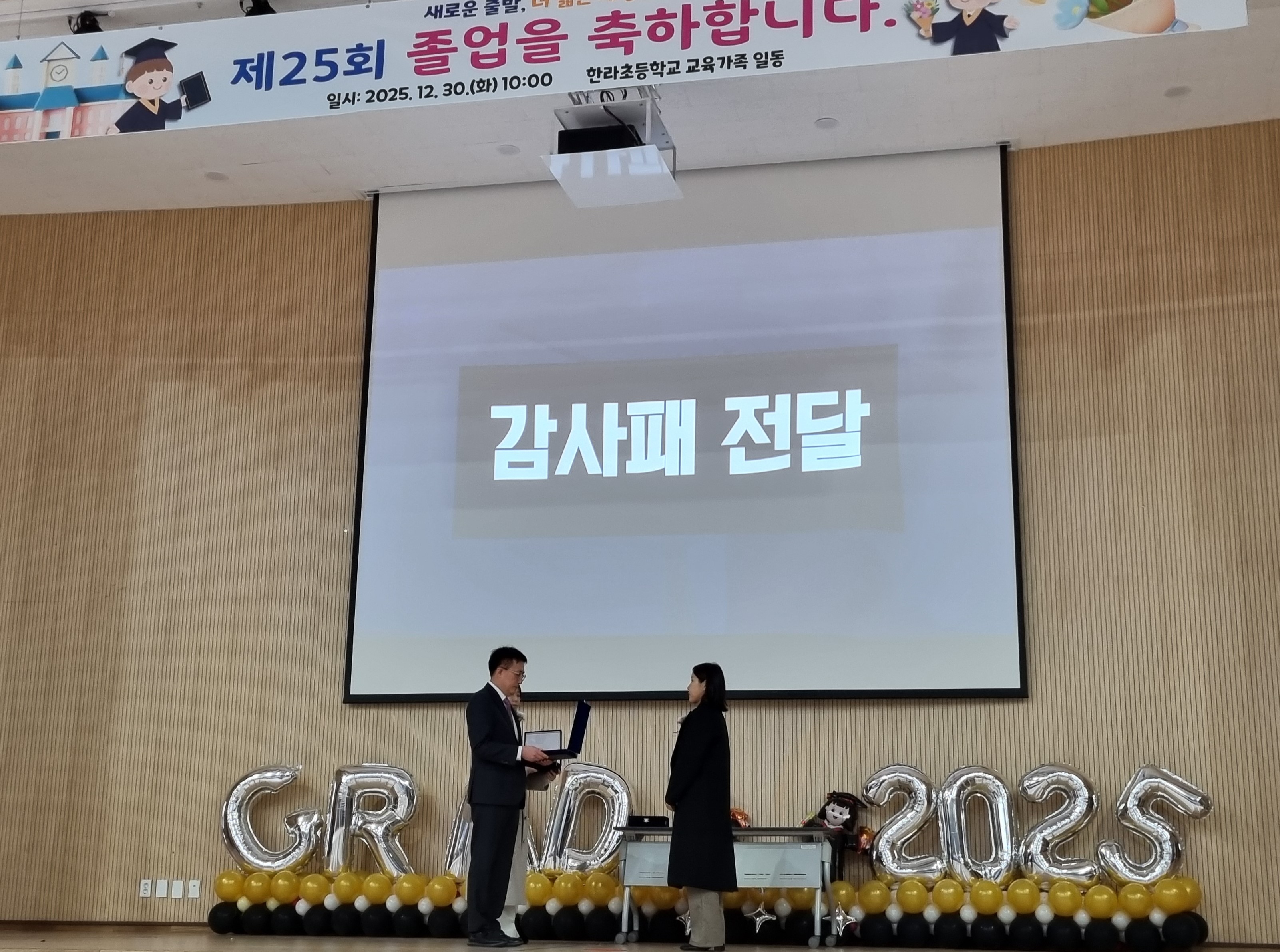 □ 한라초등학교(교장 오상남)는 12월 30일(화) 오전 10시부터 한라관(체육관)에서 제25회 졸업식을 개최하여 졸업생들의 새로운 출발을 따뜻하게 응원하였다. 이날 졸업식에는 졸업생 359명과 학부모, 교직원이 참석해 지난 6년간의 성장과 노력을 함께 축하해 주었다.