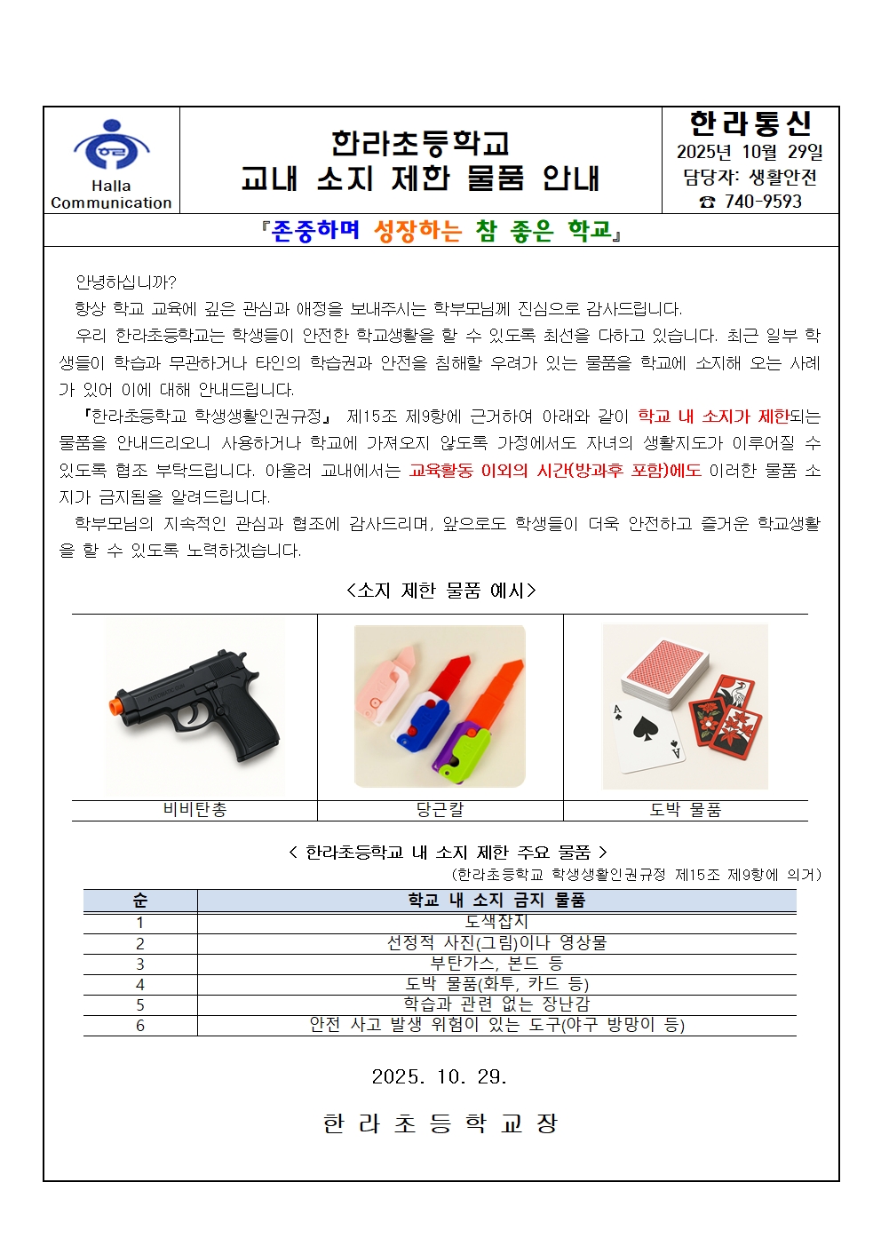 한라초등학교 교내 소지 제한 물품 안내
