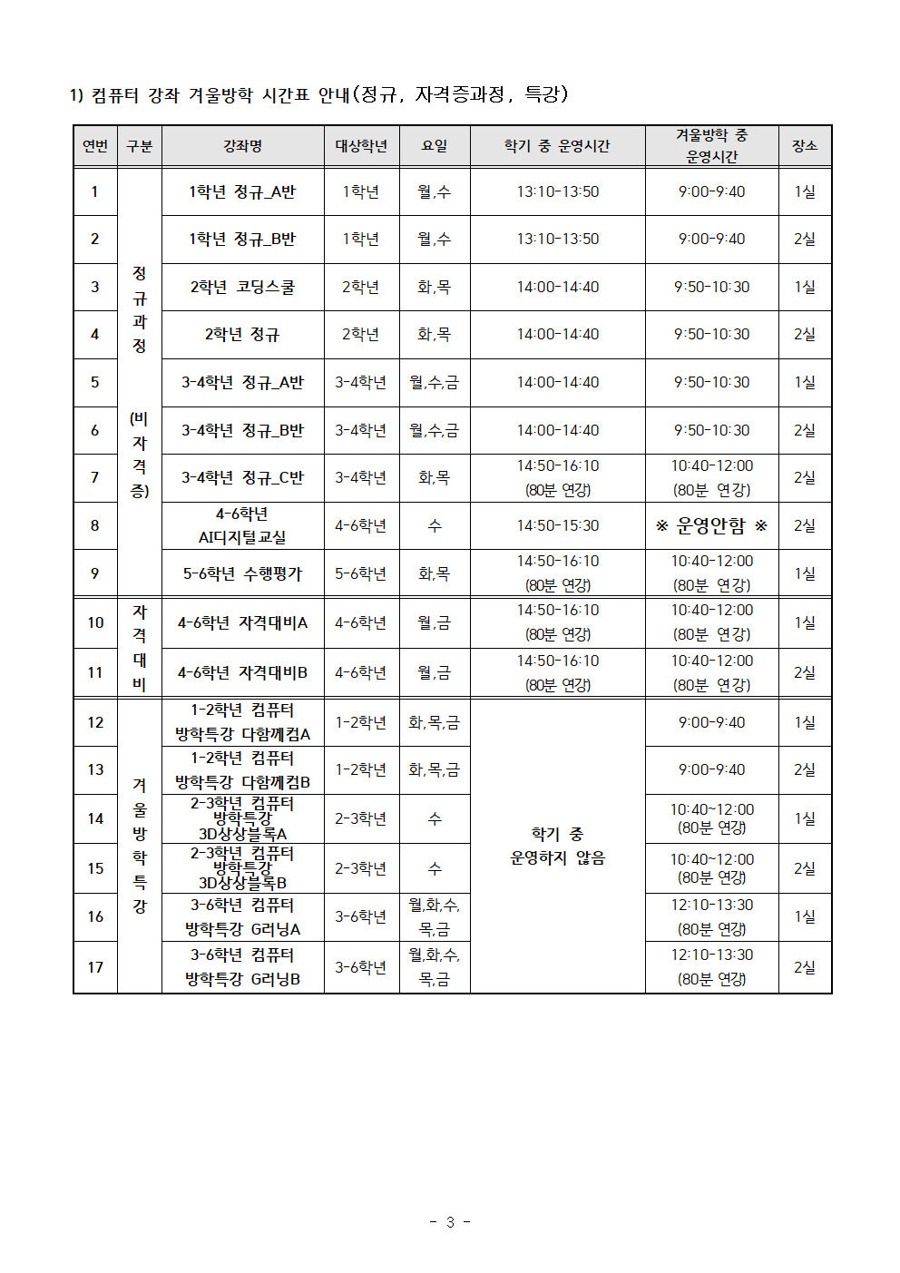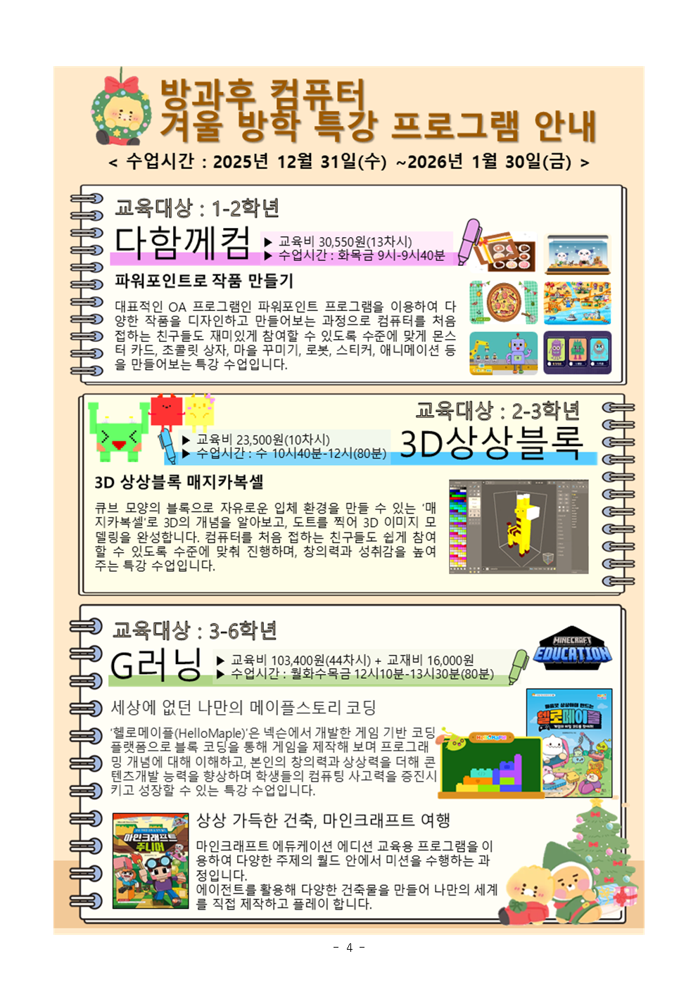 2025학년도 선택형 방과후 프로그램 겨울방학 컴퓨터 특강 모집 및 운영 안내
