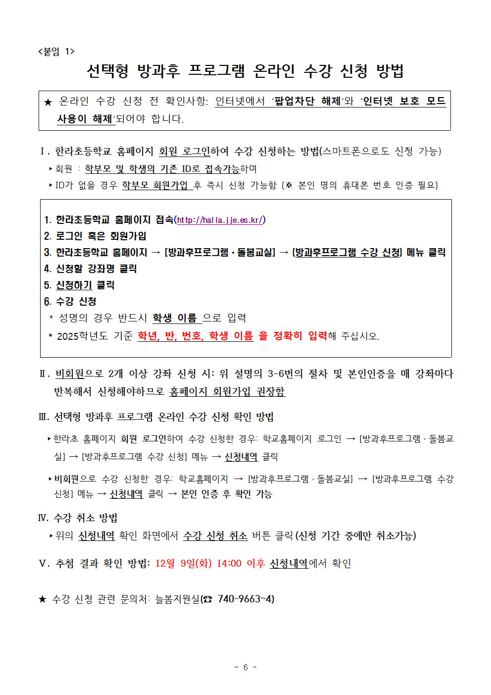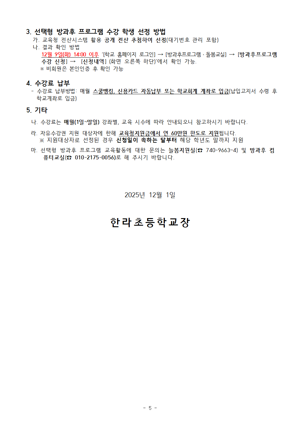 선택형 방과후프로그램 운영 계획 및 공지사항
