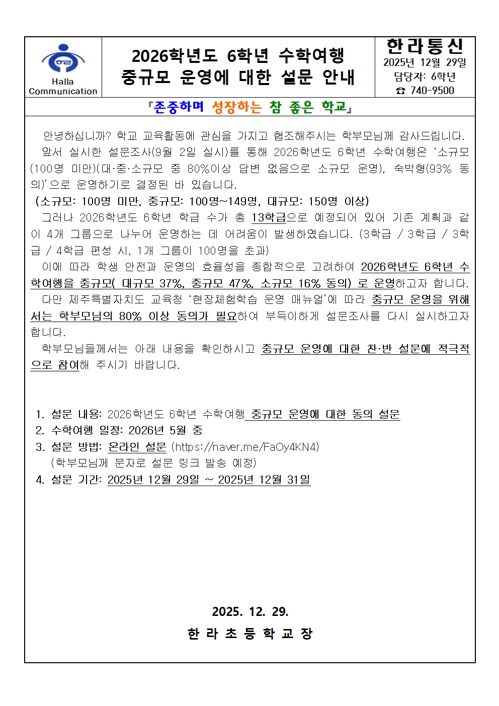 2026학년도 6학년 수학여행 중규모 운영에 대한 설문 안내