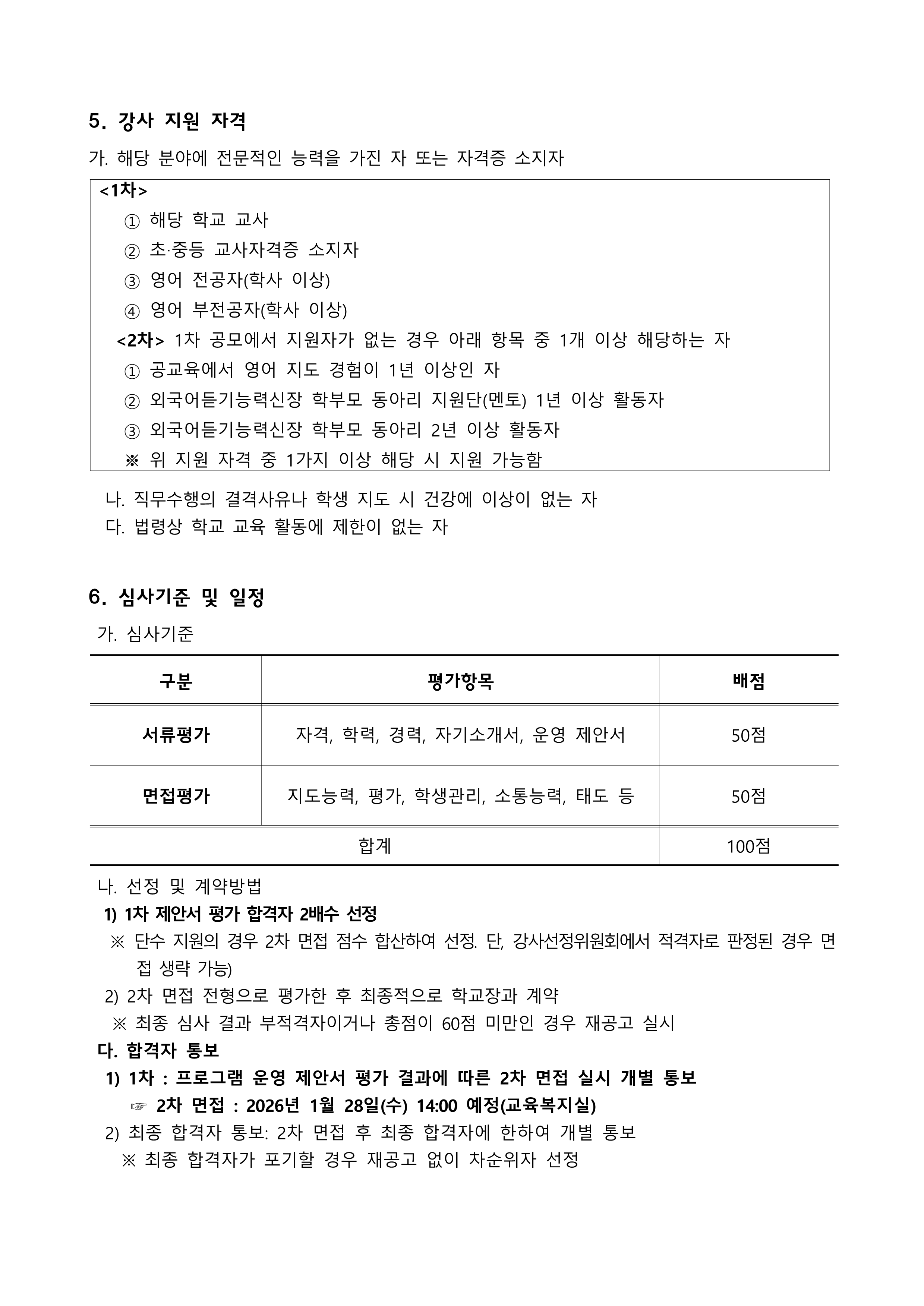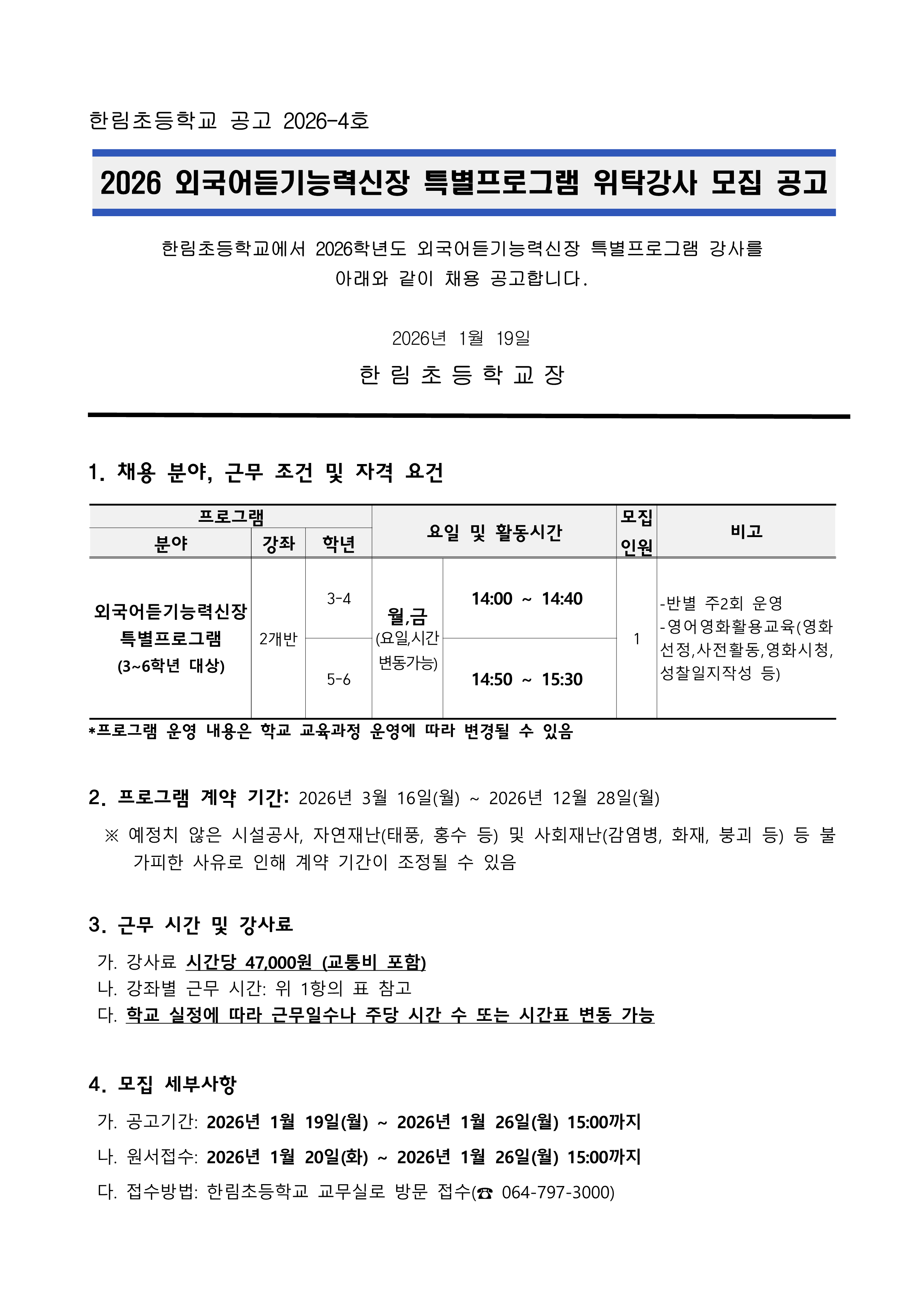 2026 외국어듣기능력신장 특별프로그램 위탁강사 모집 공고(한림초등학교).hwp
