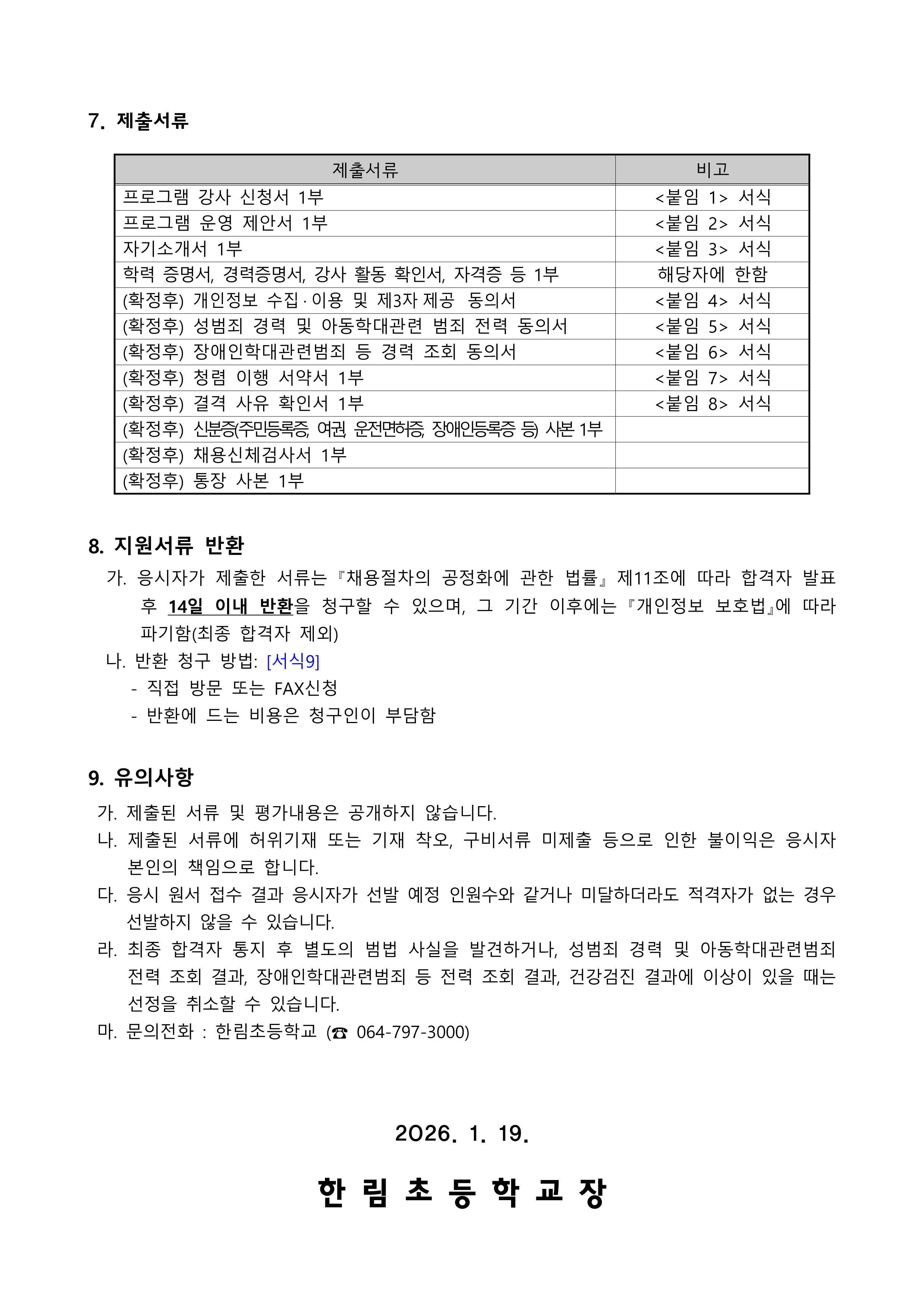 한림초 교육공무직원 연말정산자료 제출 일정 안내