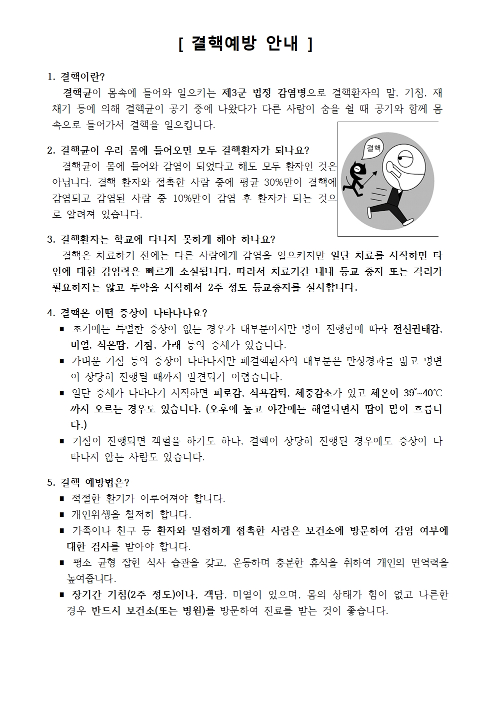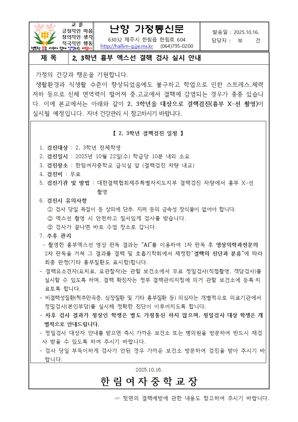 2,3학년 흉부엑스선 결핵검사 실시 안내