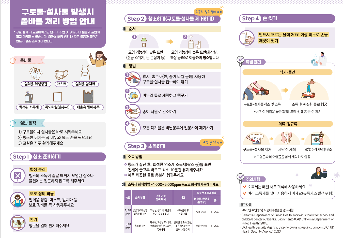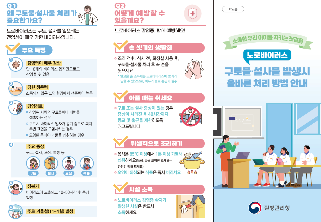 이에 노로바이러스 감염증 집단발생과 확산 예방을 위해 질병관리청에서 제작한 안내문을 첨부하오니 감염증 예방에 적극 협조 부탁드립니다.