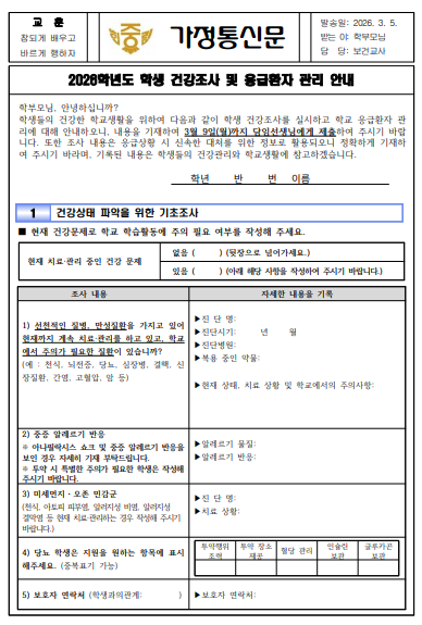 2026학년도 학생 건강조사 및 응급환자 관리 안내