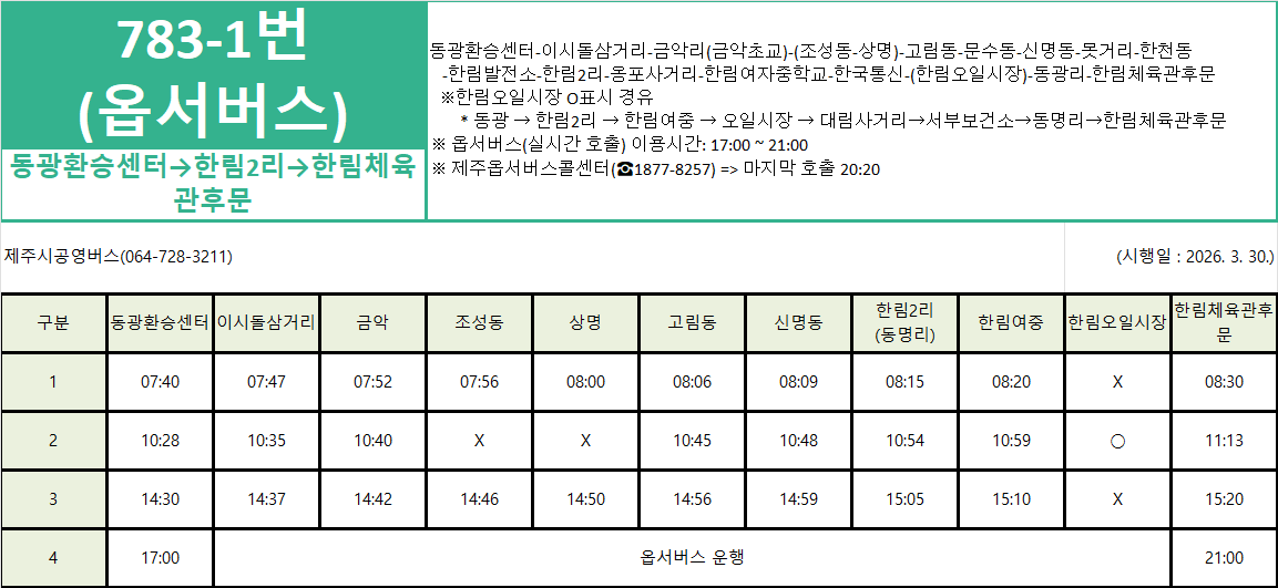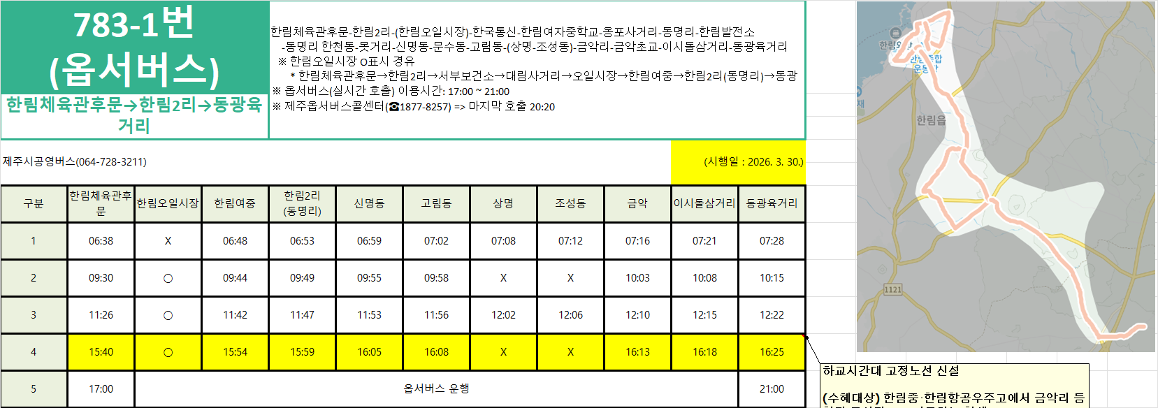 제주특별자치도에서는 배차시간 단축 및 공영버스 운영 효율화를 위해 수요응답형 옵서버스(호출방식 대중교통)를 운영하고 있으며, 이용 만족도 제고를 위해 아래와 같이 한림읍 관내 학교 하교시간대에 고정노선을 운영할 계획임을 알려드리오니 참고하시기 바랍니다.