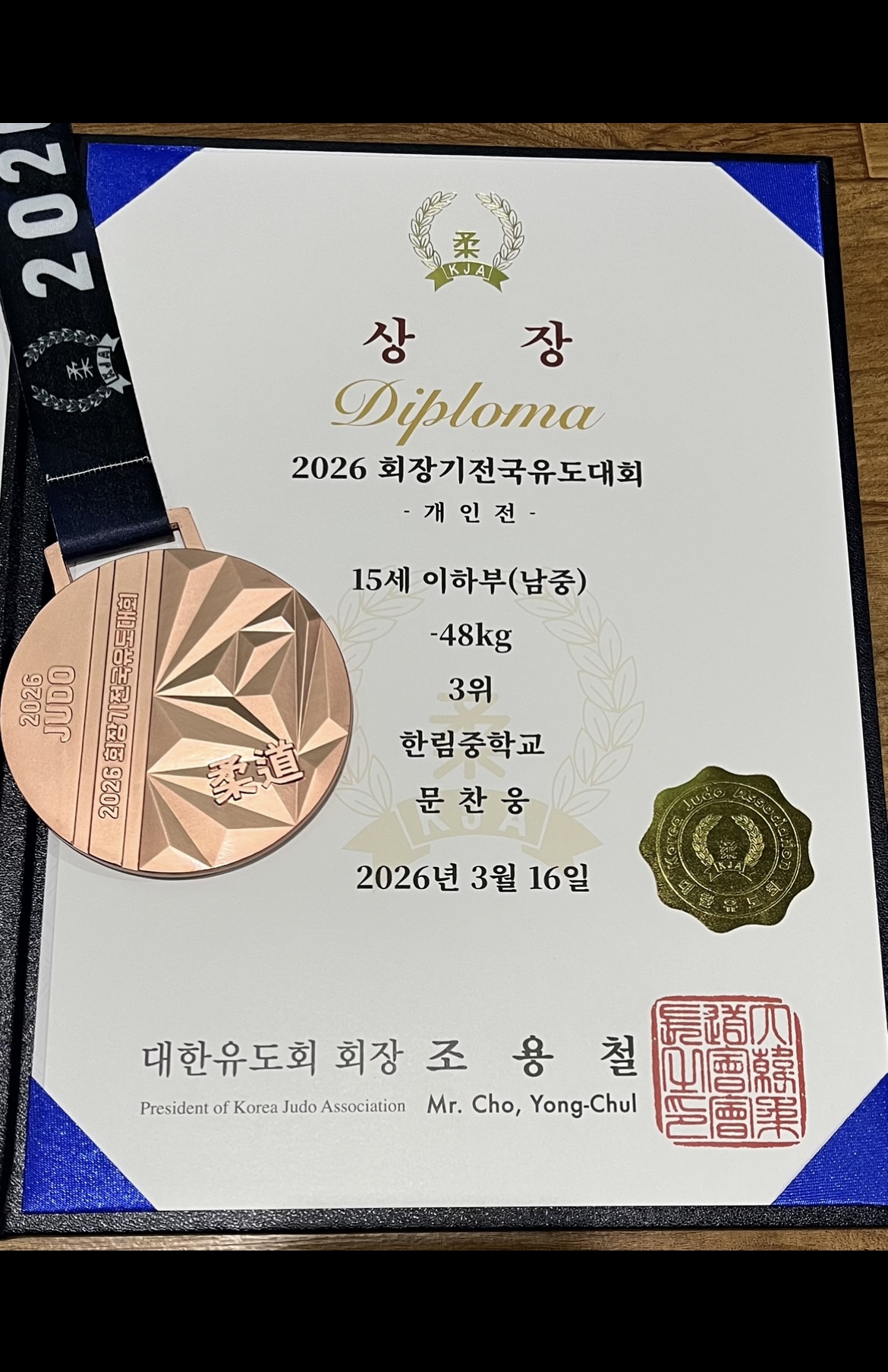 2학년 문찬웅 학생이 15세 이하부(-48kg)에서 3위를 차지하였습니다.