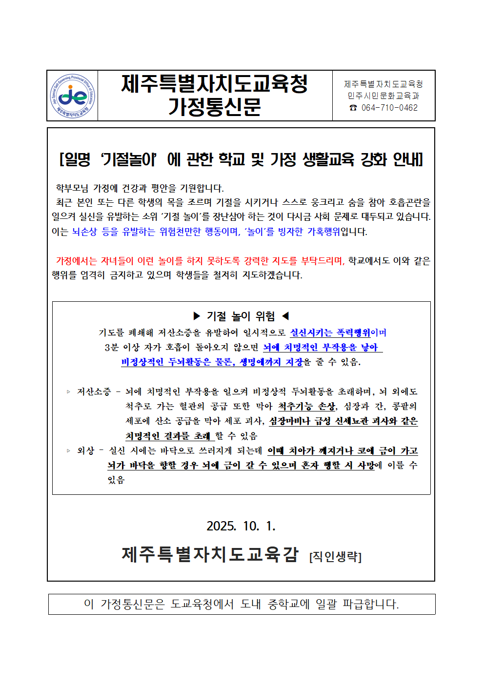기절놀이 관련 학교 및 가정 생활교육 강화 안내 가정통신문