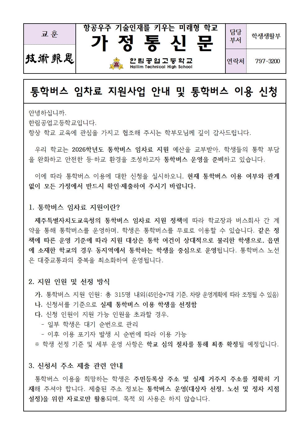 2) 가정통신문 뒷면의 통학버스 이용 신청서에 ‘이용 / 이용하지 않음’ 중 하나를 선택하여 모든 학생이 제출해주시기 바랍니다.