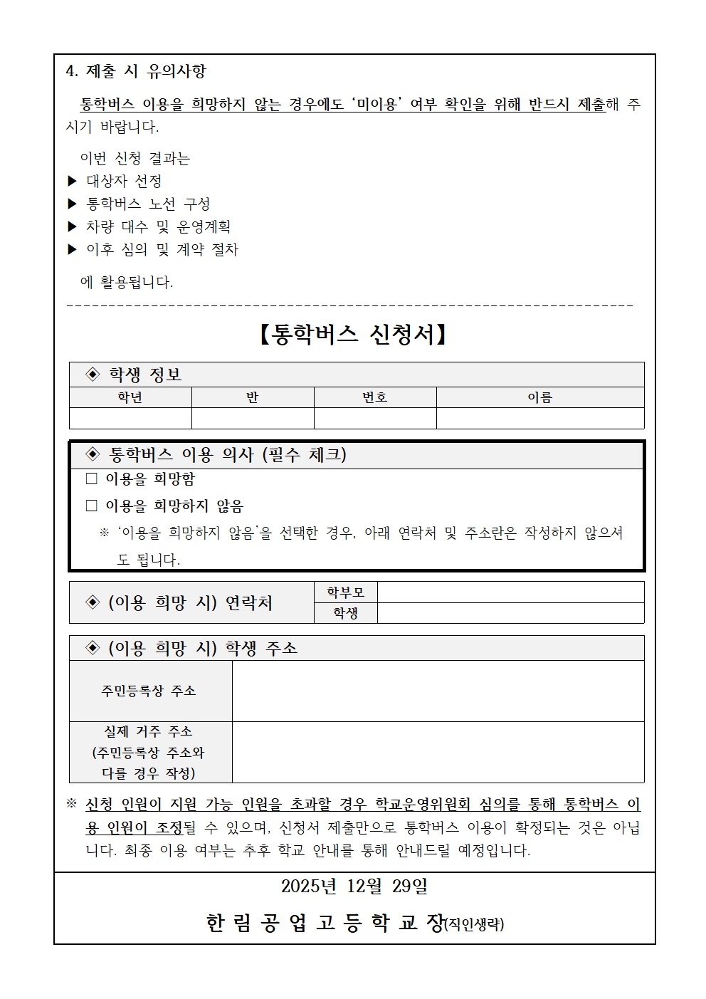 가. 제출된 신청서는 통학버스 이용 학생 선정 및 통학버스 운영·노선 계획 수립을 위한 자료로 활용됩니다.