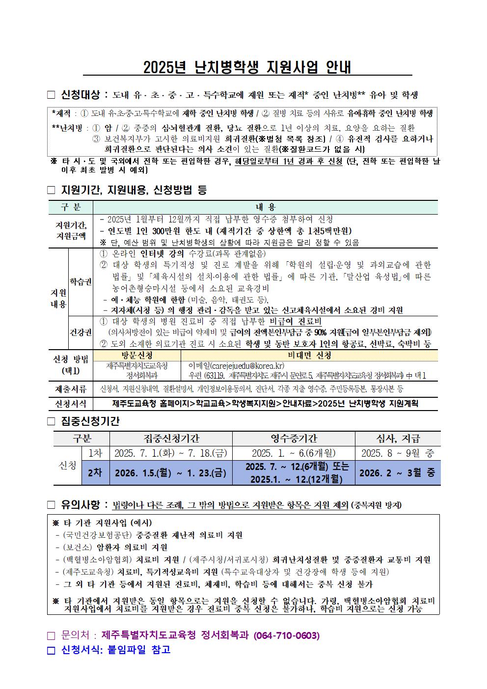 2025년 난치병학생 지원사업 안내(2차 신청)