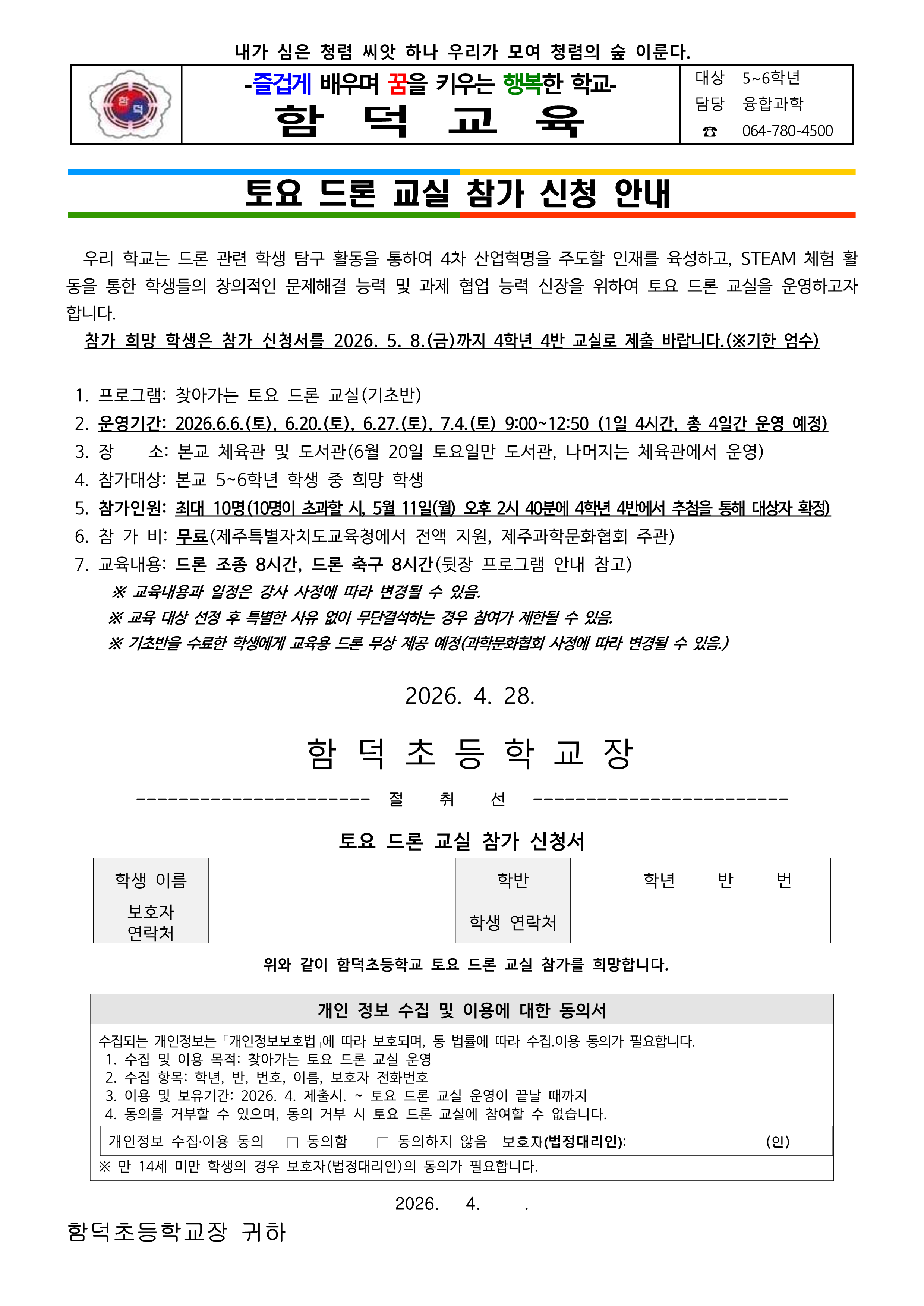 2026 함덕초 토요 드론교실 참가 신청 안내(5,6학년 대상)