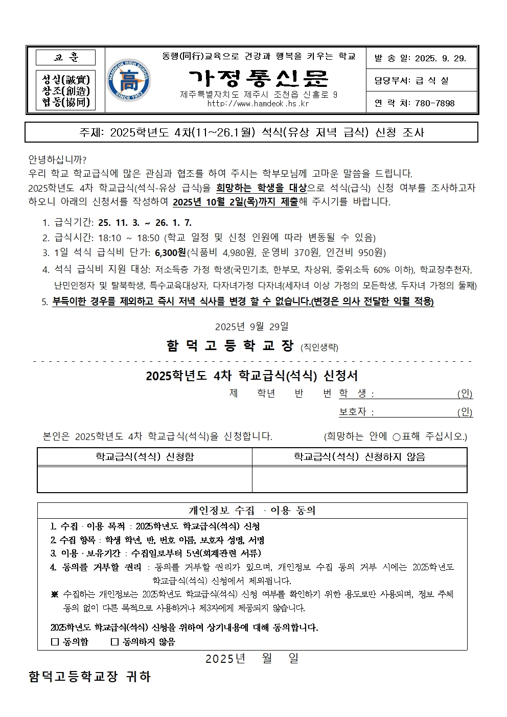 2025학년도 4차(11~26.1월) 석식 신청 조사
