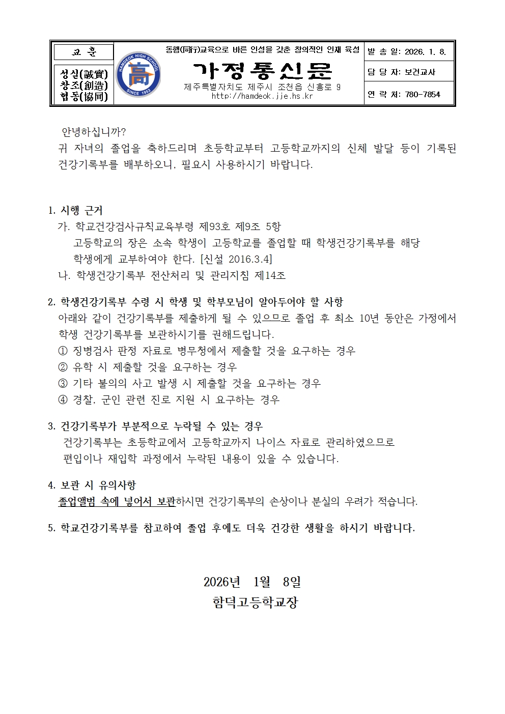 고3 졸업생 대상 건강기록부 배부 안내문