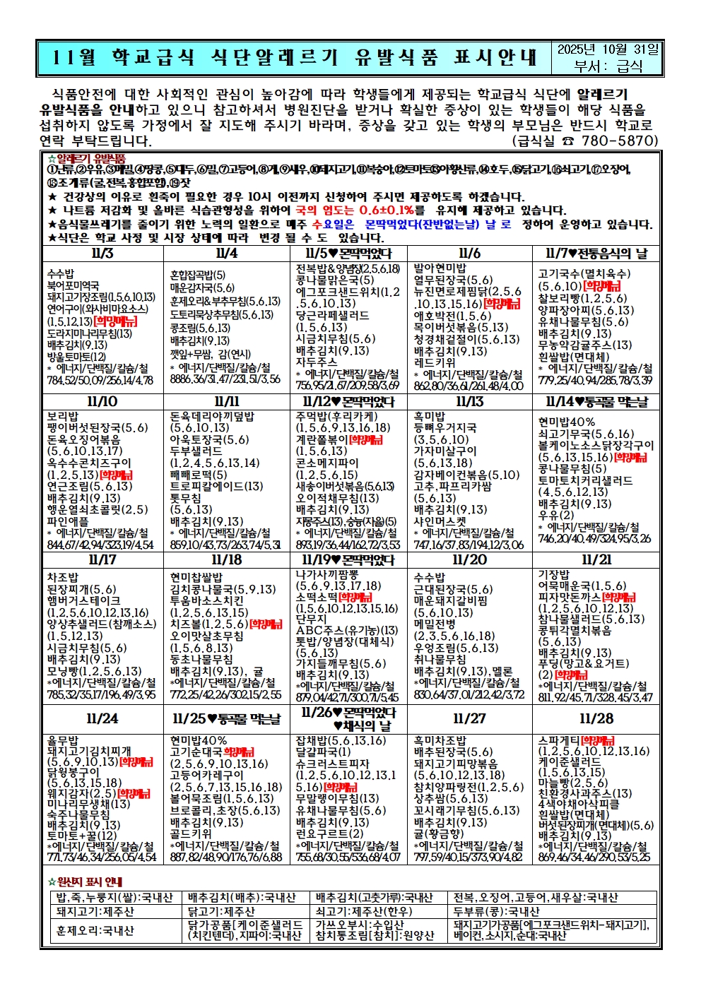 2025년 11월 학교급식 식단 알레르기 유발식품 표시 안내