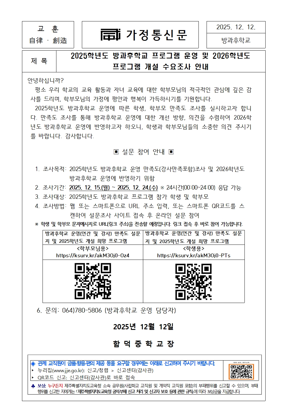 2025학년도 방과후학교 프로그램 운영 및 2026학년도 프로그램 개설 수요조사 안내