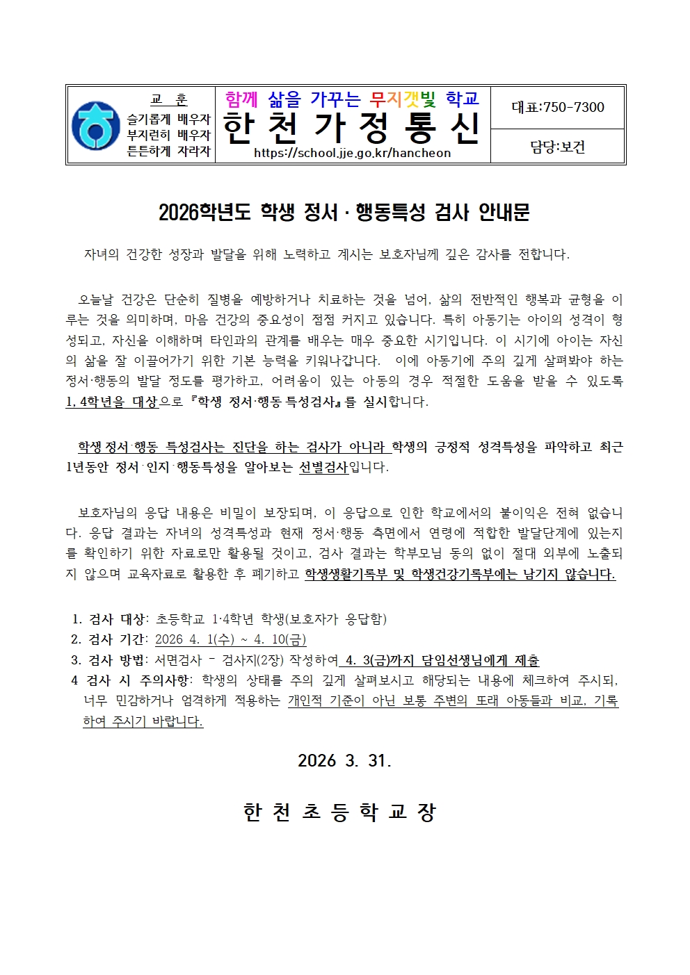 [가정통신문] 2026학년도 1,4학년 학생 정서.행동특성검사 실시 안내