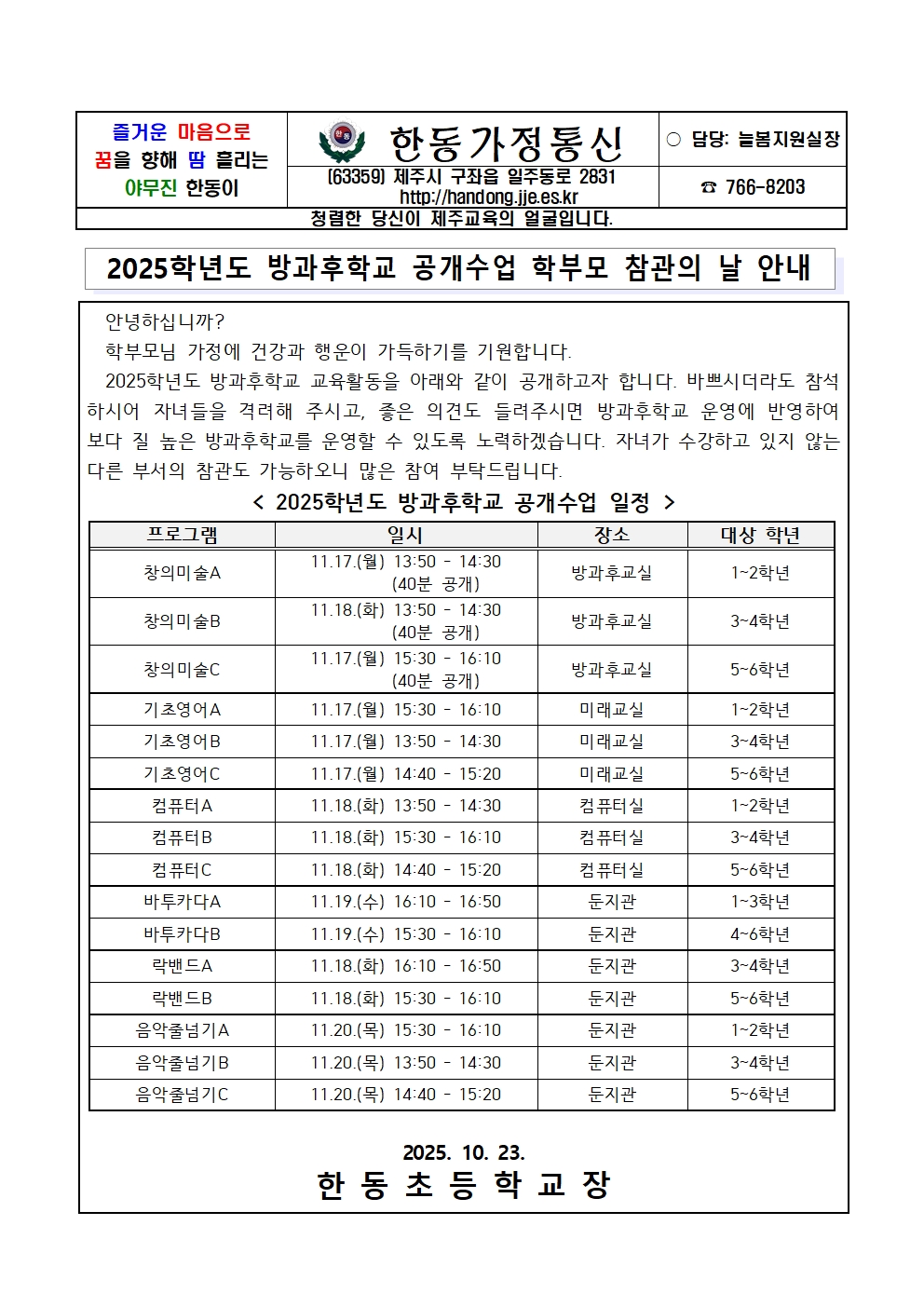 2025학년도 방과후학교 공개수업 학부모 참관의 날 안내