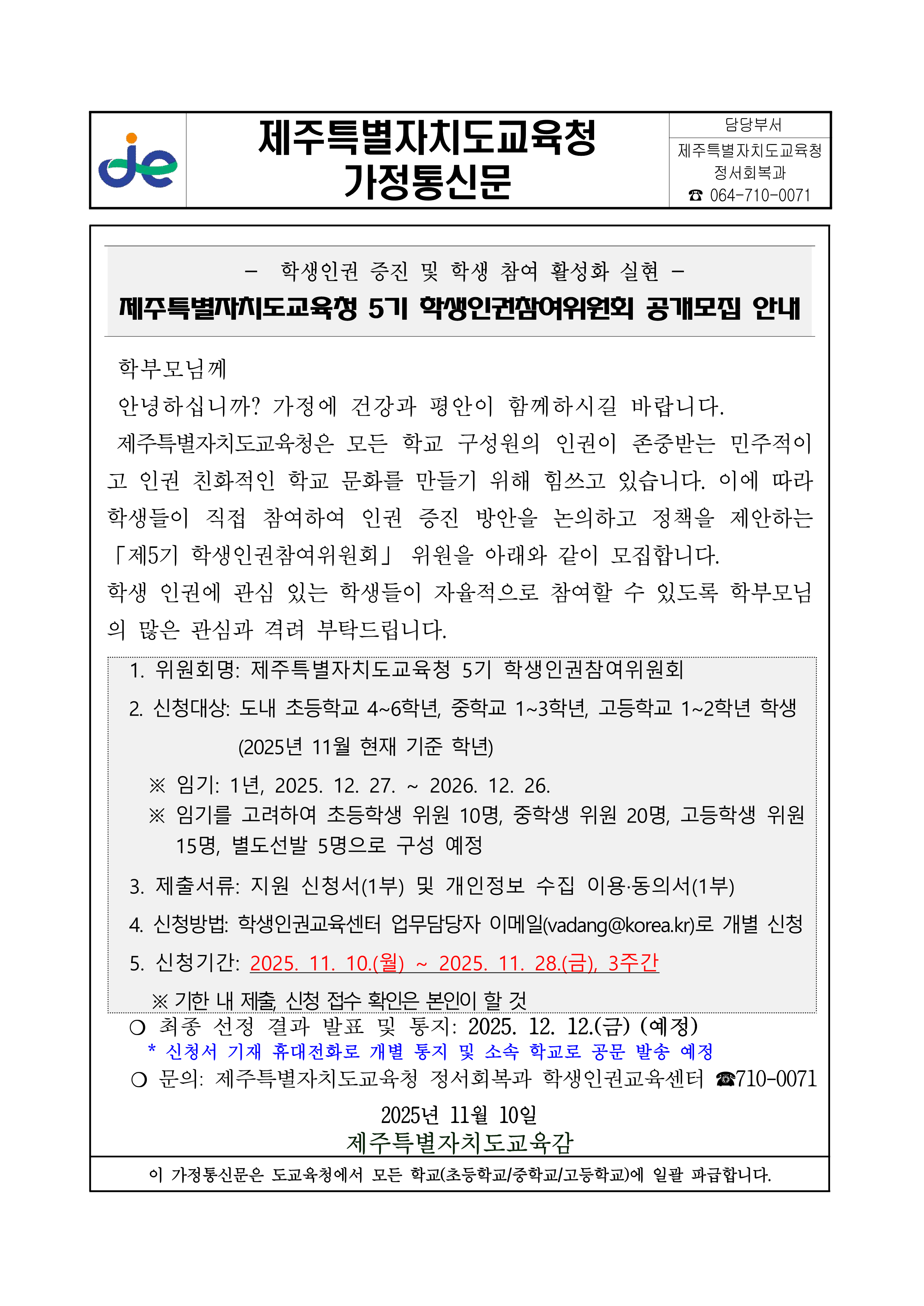 제주특별자치도교육청 정서회복과_제주특별자치도교육청 5기 학생인권참여위원회 위원 모집 가정통신문.hwp