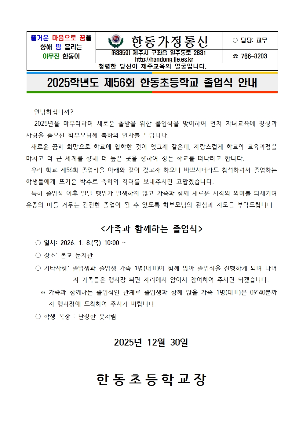 2025학년도 제56회 한동초등학교 졸업식 안내 가정통신문