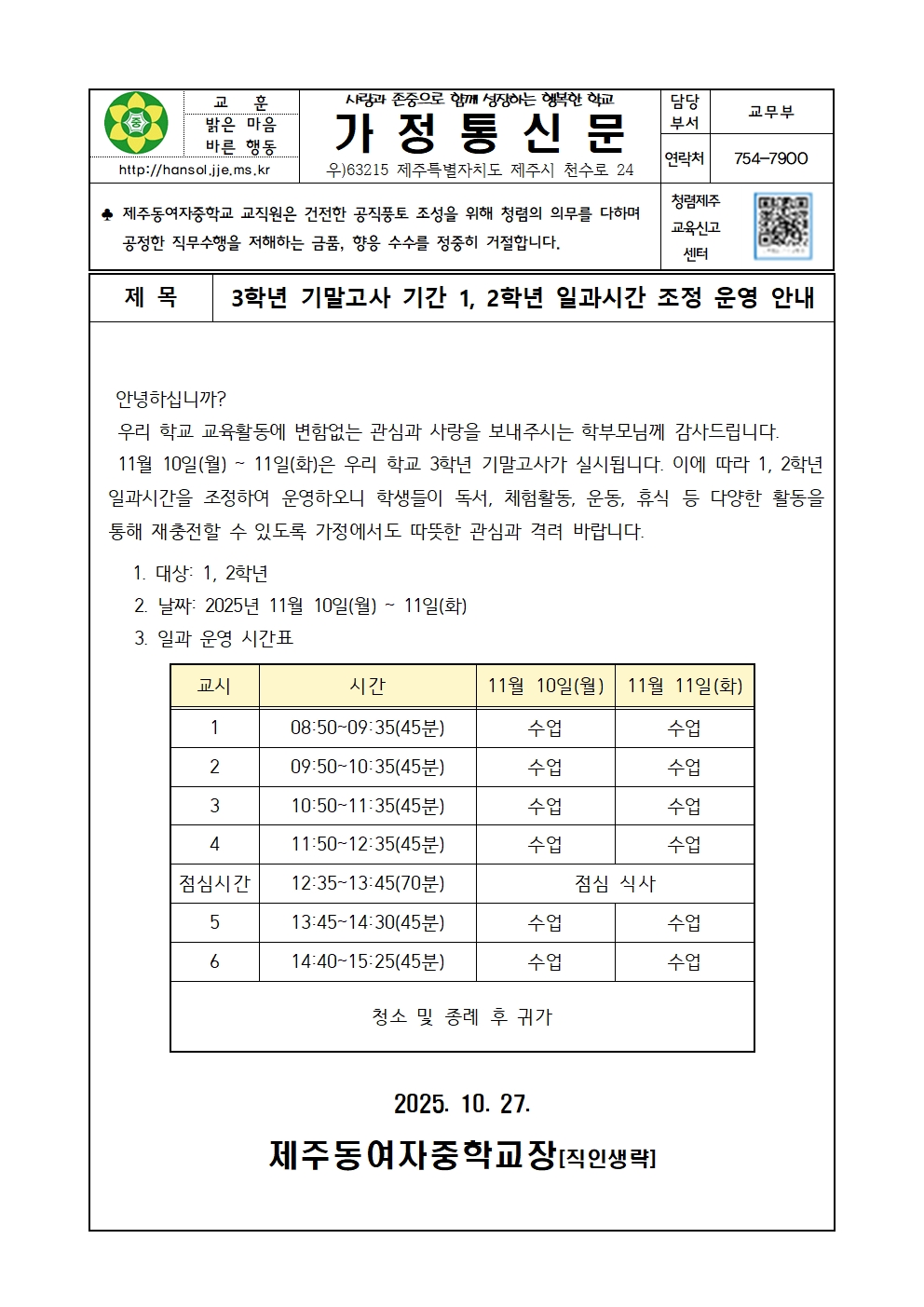 2025학년도 2학기 3학년 기말고사 기간 1, 2학년 일과시간 조정 운영 안내