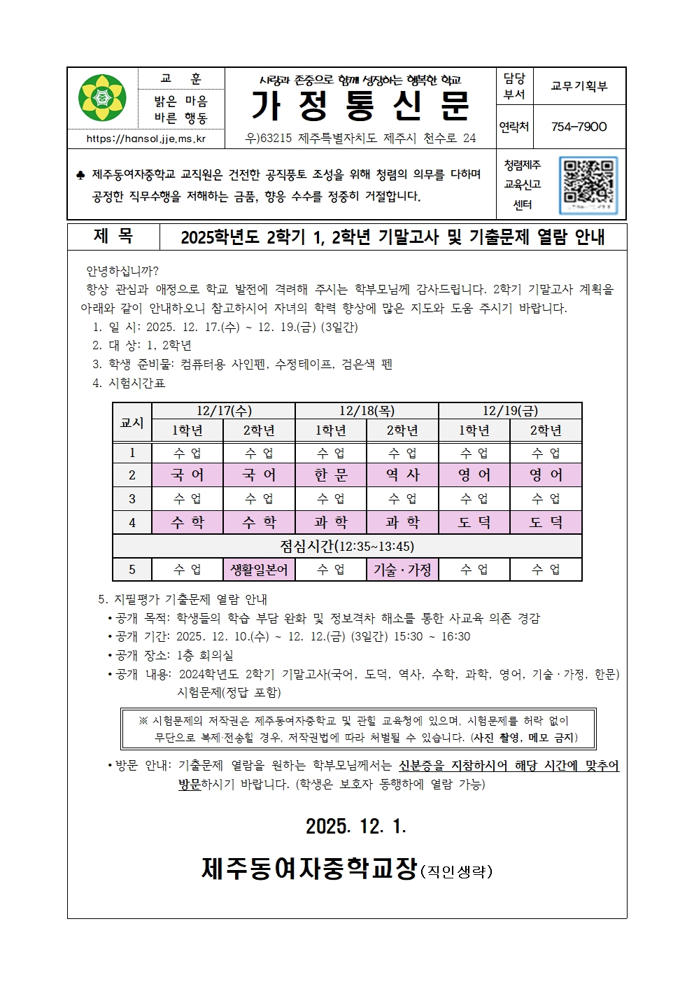 가정통신문_2025학년도 2학기 1, 2학년 기말고사 및 기출문제 열람 안내.hwp