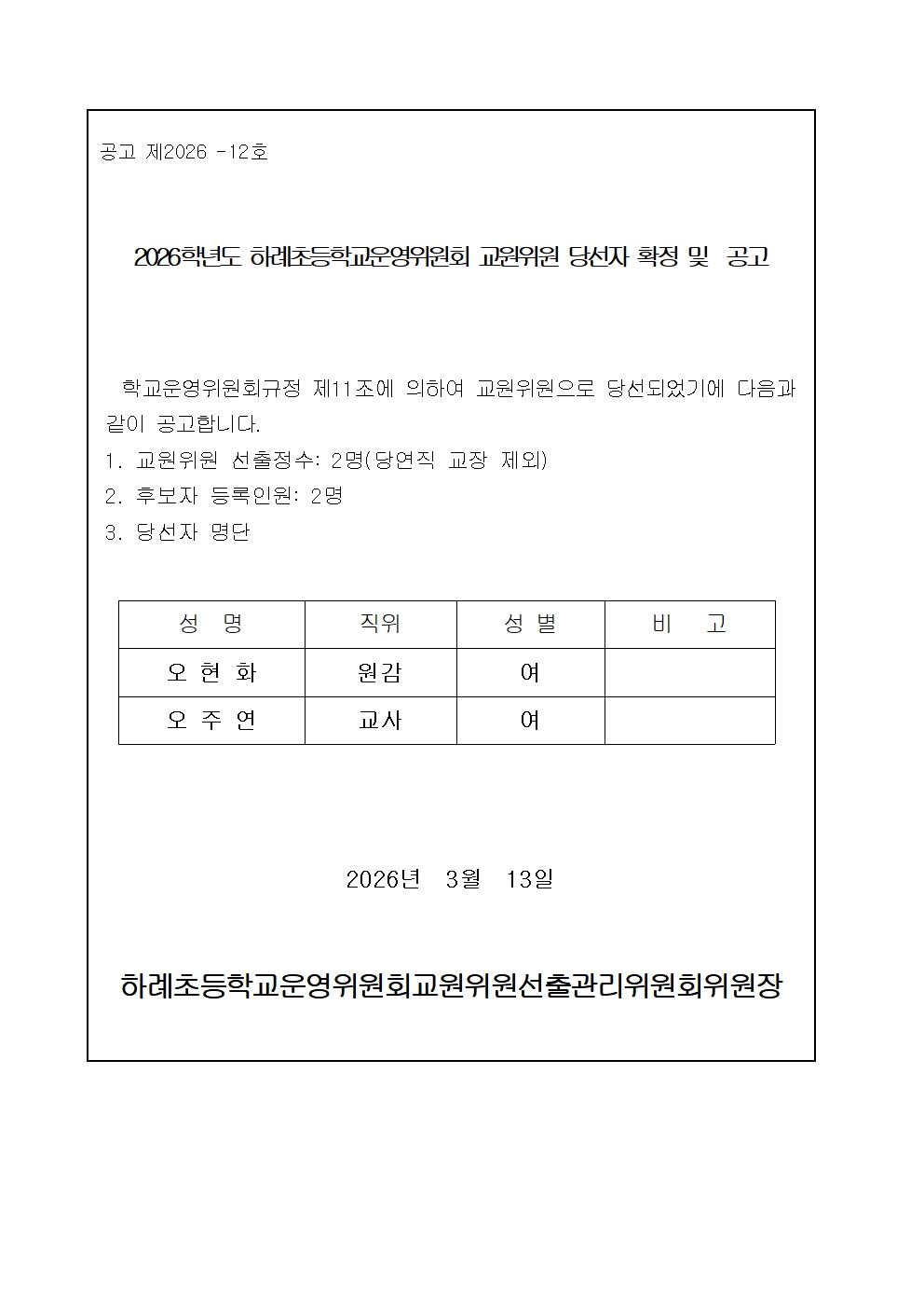 2026학년도 하례초등학교운영위원회 교원위원 당선자확정 공고