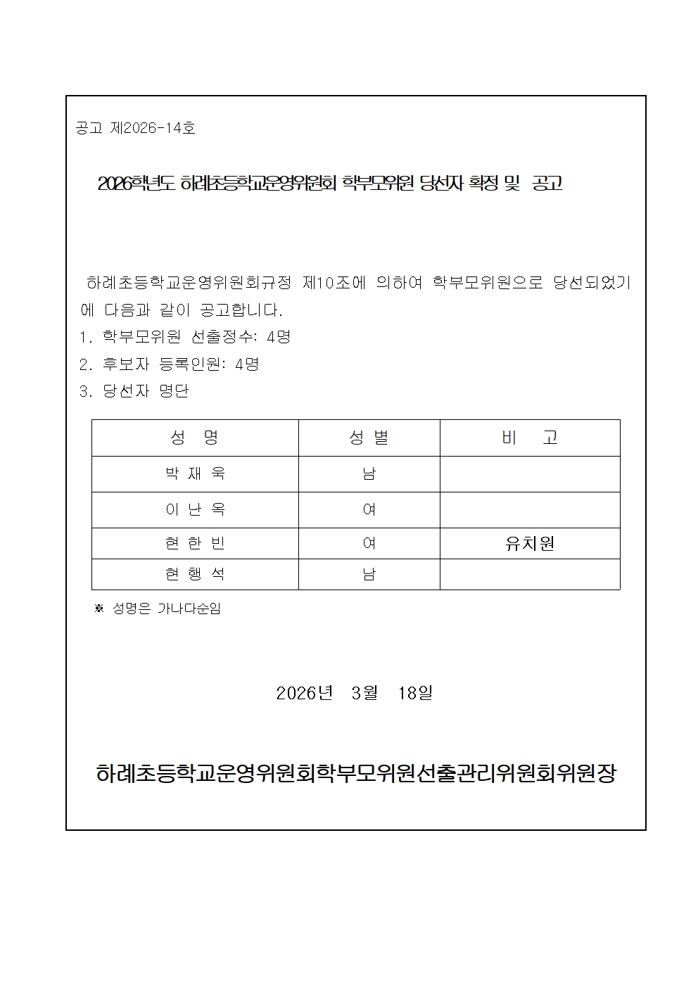 2026학년도 하례초등학교운영위원회 학부모위원 당선자 확정 및 공고