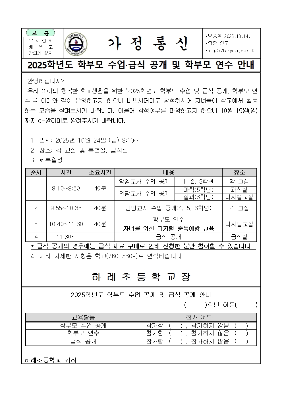 2025학년도 학부모 수업‧급식 공개 및 학부모 연수 안내